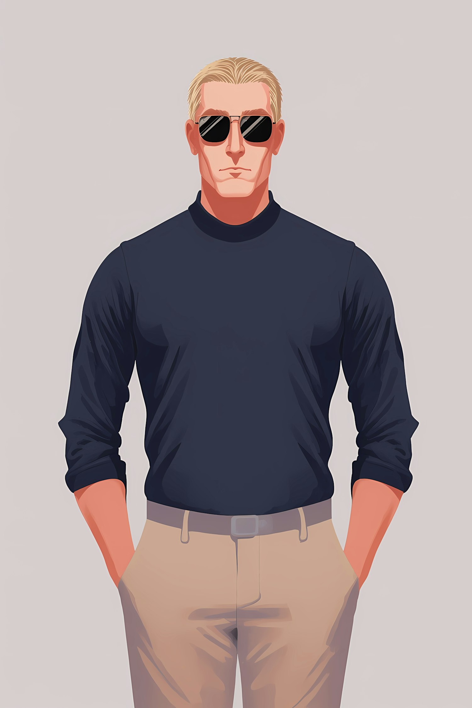 Stylized illustration of a man in sunglasses, navy shirt, and beige pants, standing confidently against a neutral background.