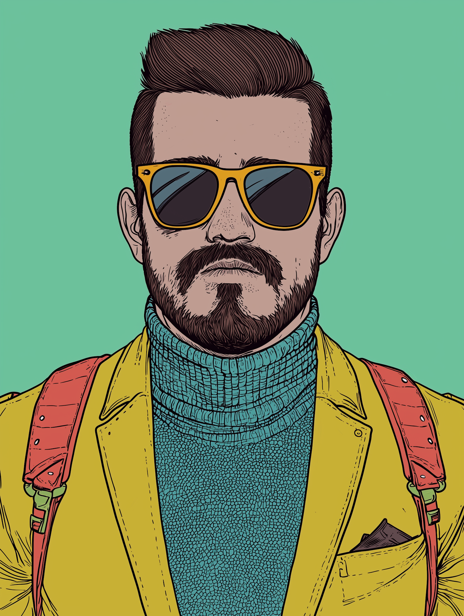 Stylish illustration of a man with sunglasses, yellow jacket, teal turtleneck, and red backpack against a mint green background.