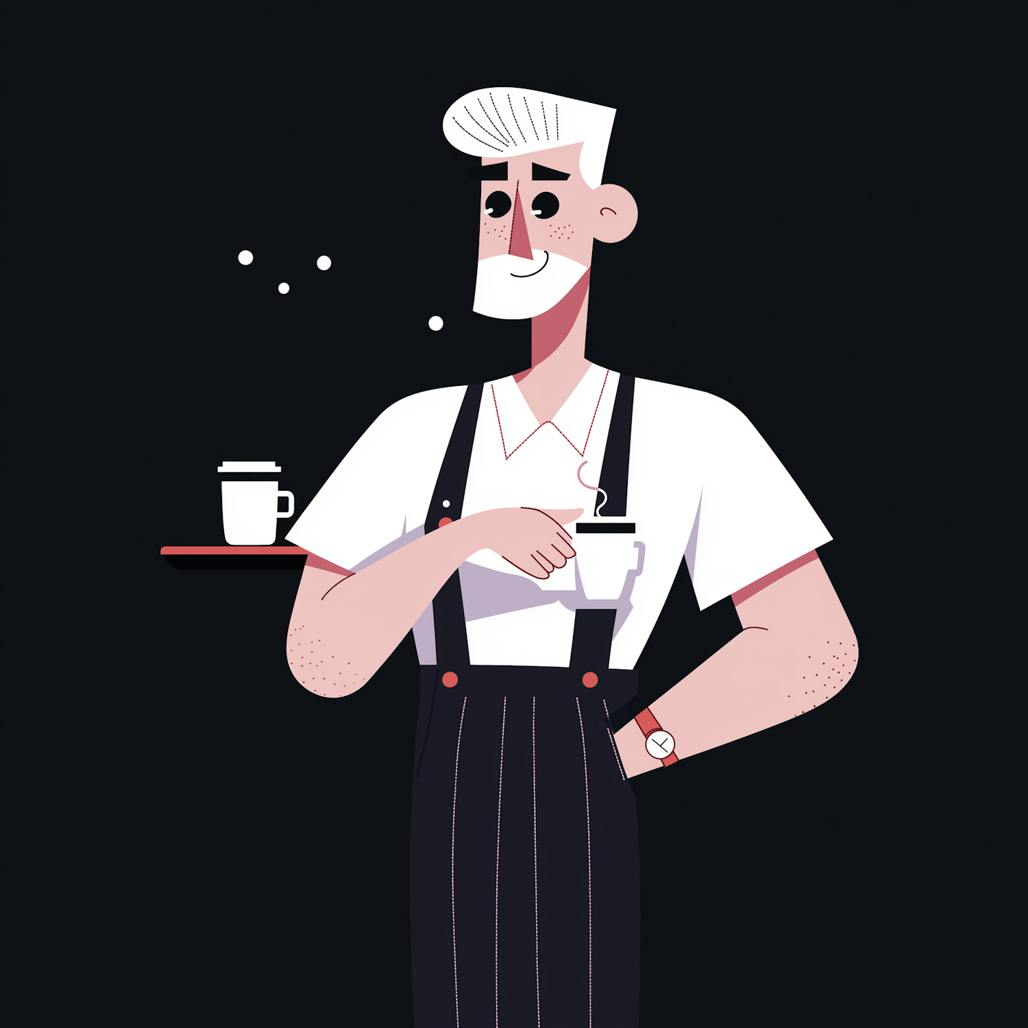 Stylized illustration of a cheerful man with white hair and beard, holding a coffee cup, wearing suspenders and a watch, on a black background.