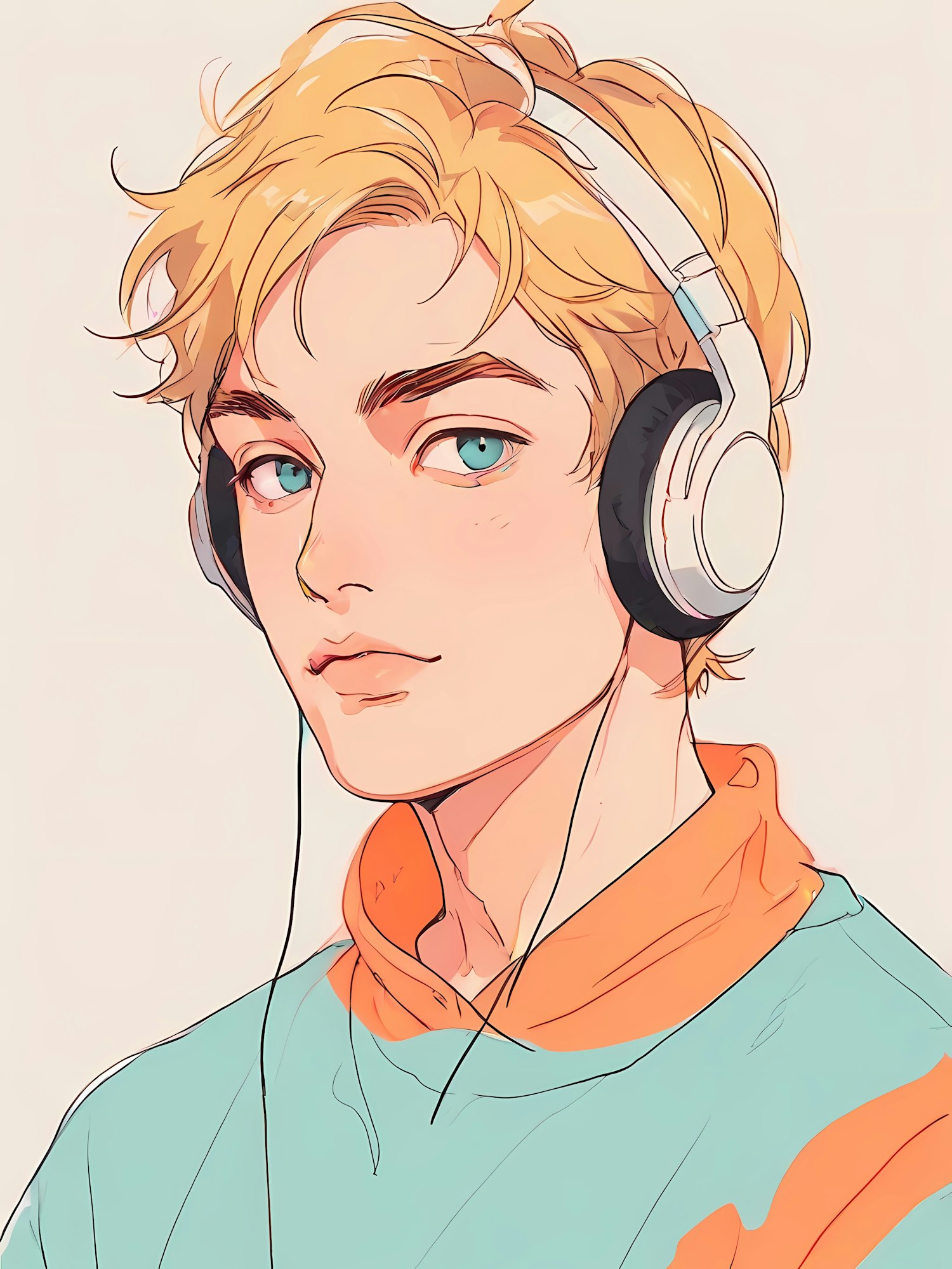 Stylized illustration of a blonde-haired young man with headphones, wearing a teal sweatshirt and orange turtleneck. Minimalist background.