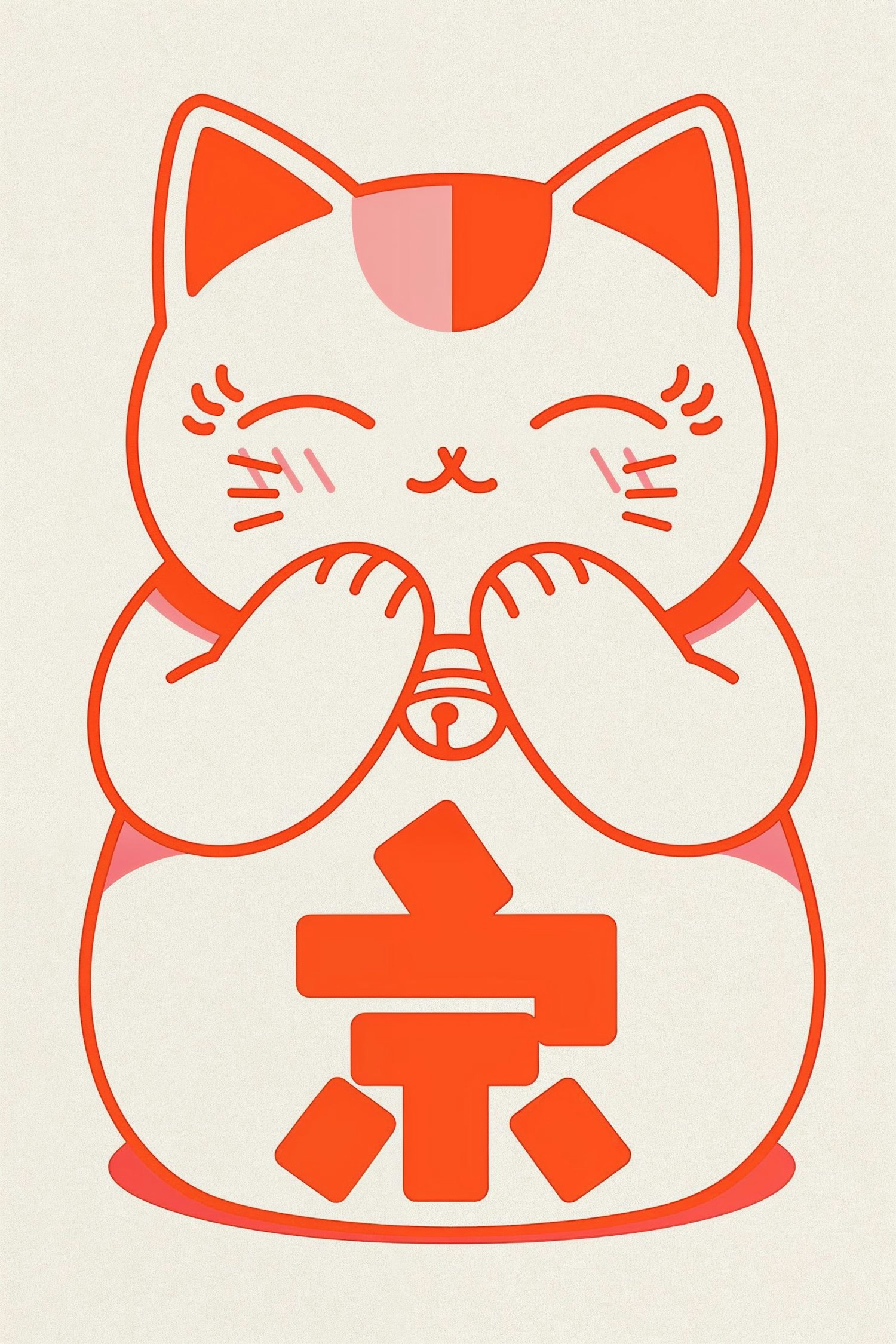 Minimalist orange and white Maneki-neko illustration with a peaceful expression and Japanese character.
