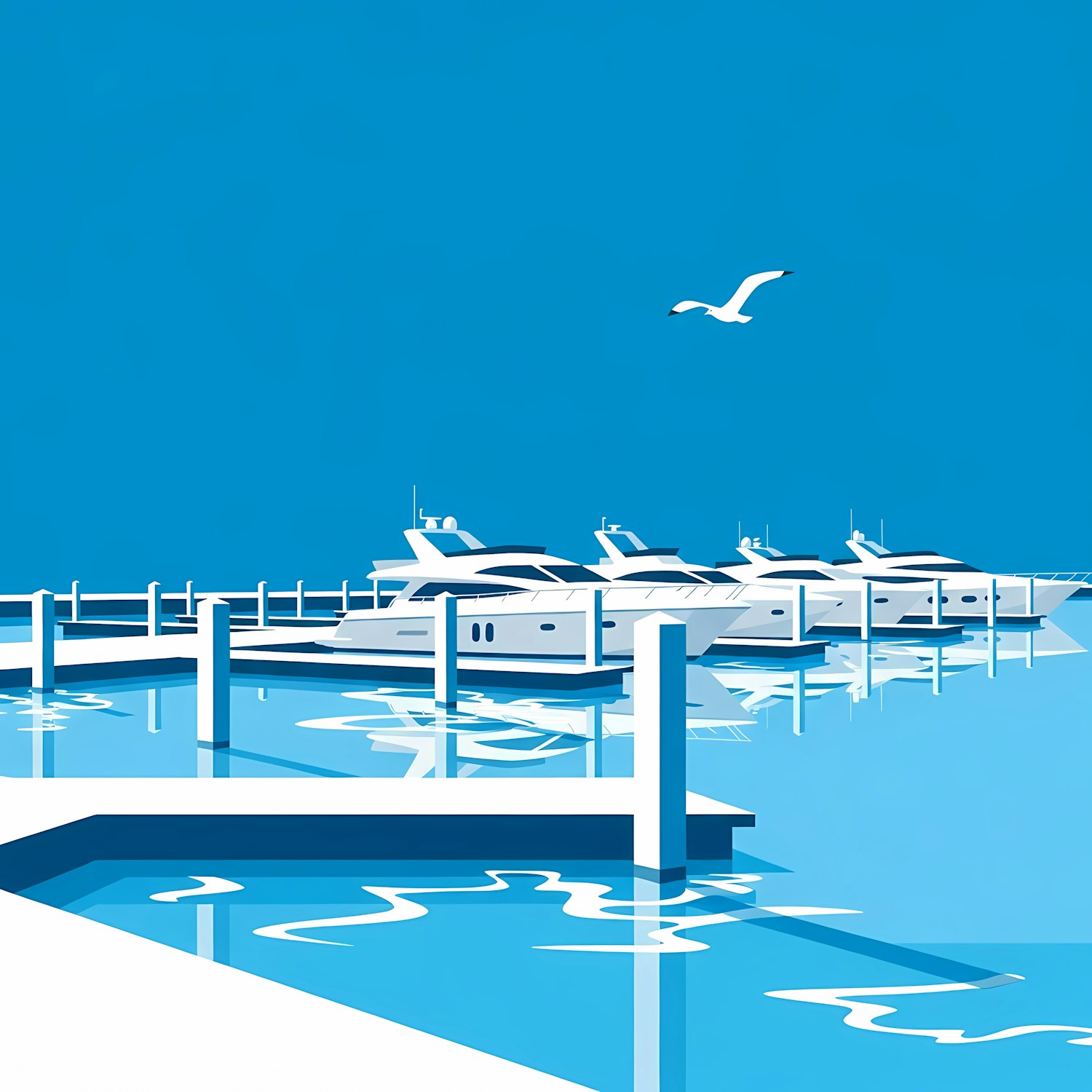 Stylized marina scene with luxury yachts, calm blue waters, and a seagull in flight, creating a serene and modern coastal vibe.