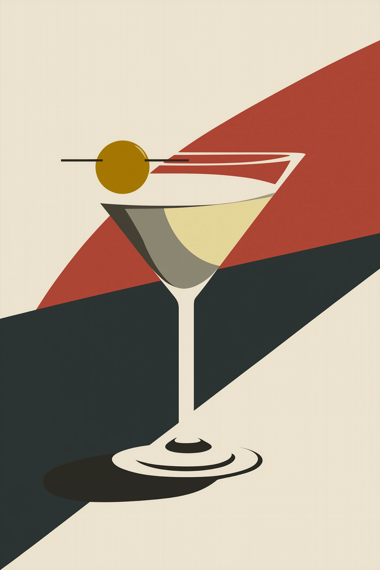 Minimalist martini glass illustration with olive, bold geometric shapes, and retro art deco style in red, black, and cream tones.