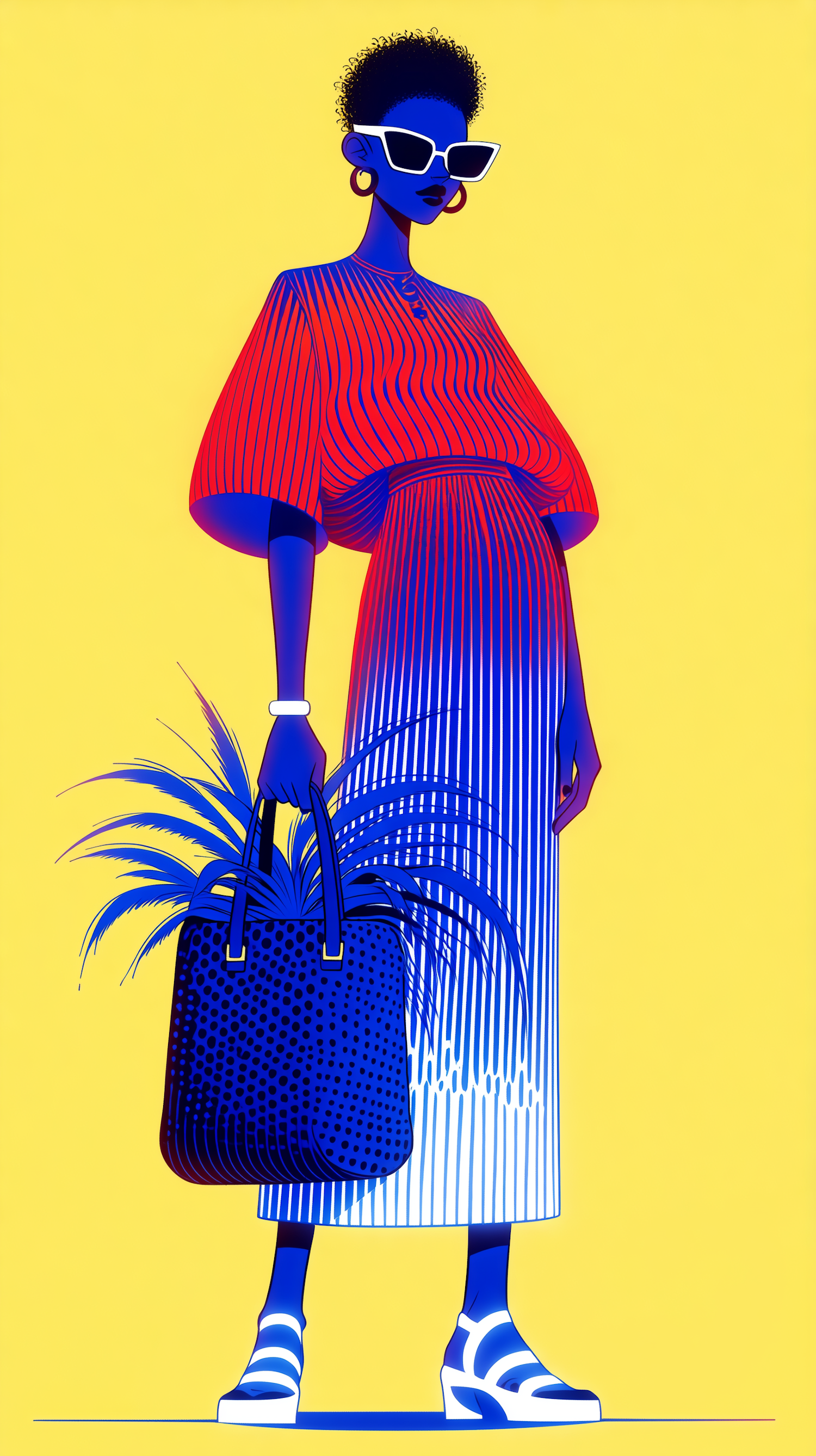 Stylized illustration of a fashionable figure in bold colors, holding a bag with a plant, set against a bright yellow background.