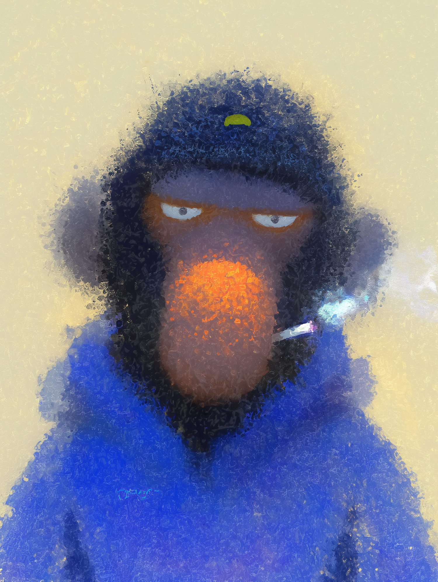 A textured digital illustration of a stylized monkey character in a blue hoodie and hat, featuring vibrant colors and an abstract style.
