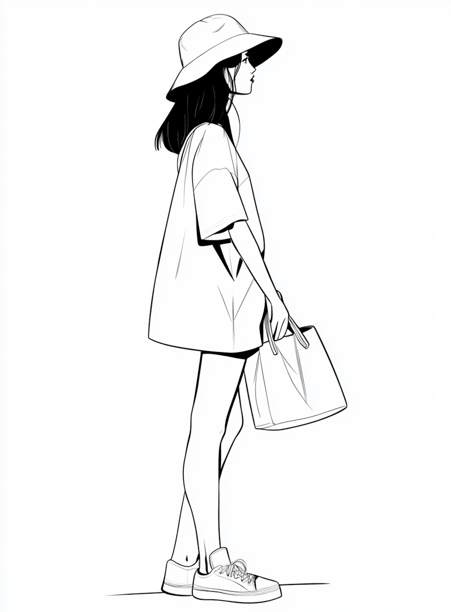 Stylish black and white illustration of a woman in a hat, oversized t-shirt, and sneakers holding a shopping bag.