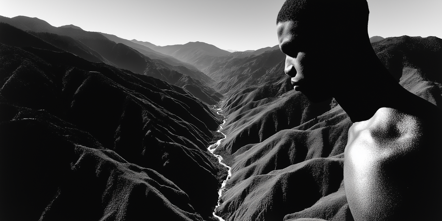 Artistic black-and-white scene pairing a dramatic mountain landscape with the silhouette of a human portrait, rich in texture.