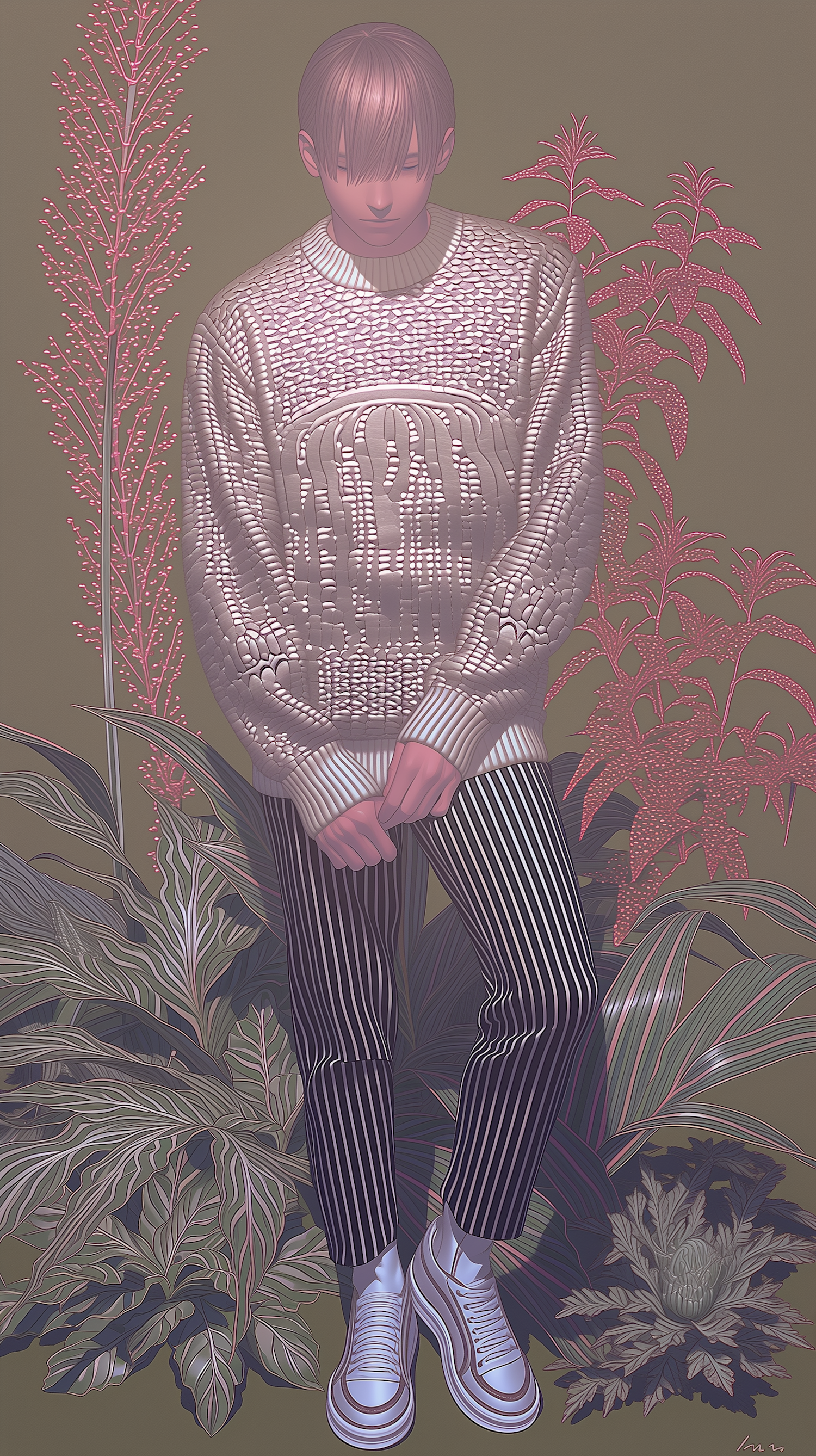 Stylized illustration of a person in a textured sweater and striped pants, surrounded by detailed foliage in soft, muted colors.