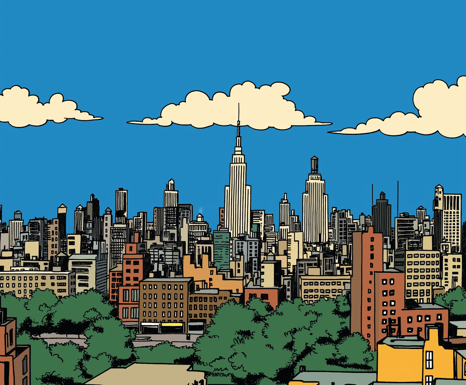Comic-style city skyline with iconic skyscrapers, lush green trees, and a bright blue sky with fluffy clouds.