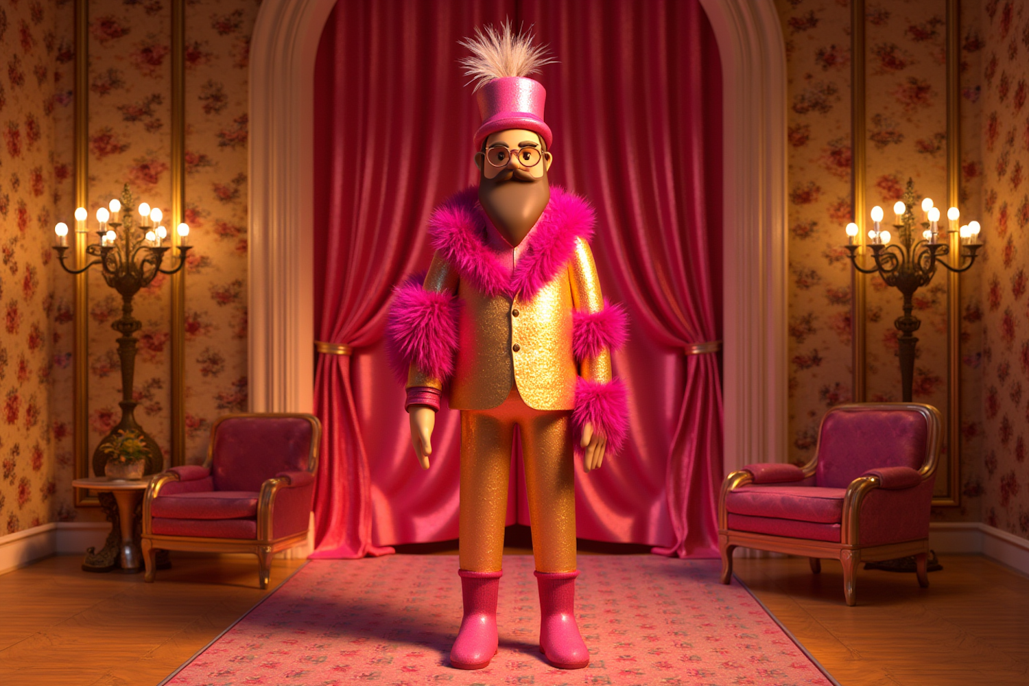 A vibrant character in a gold and pink outfit stands in a lavish room with floral wallpaper, pink curtains, and vintage furniture.