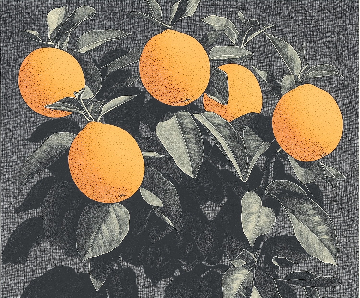 Stylized illustration of five vibrant oranges on a branch with lush green leaves against a muted gray background.