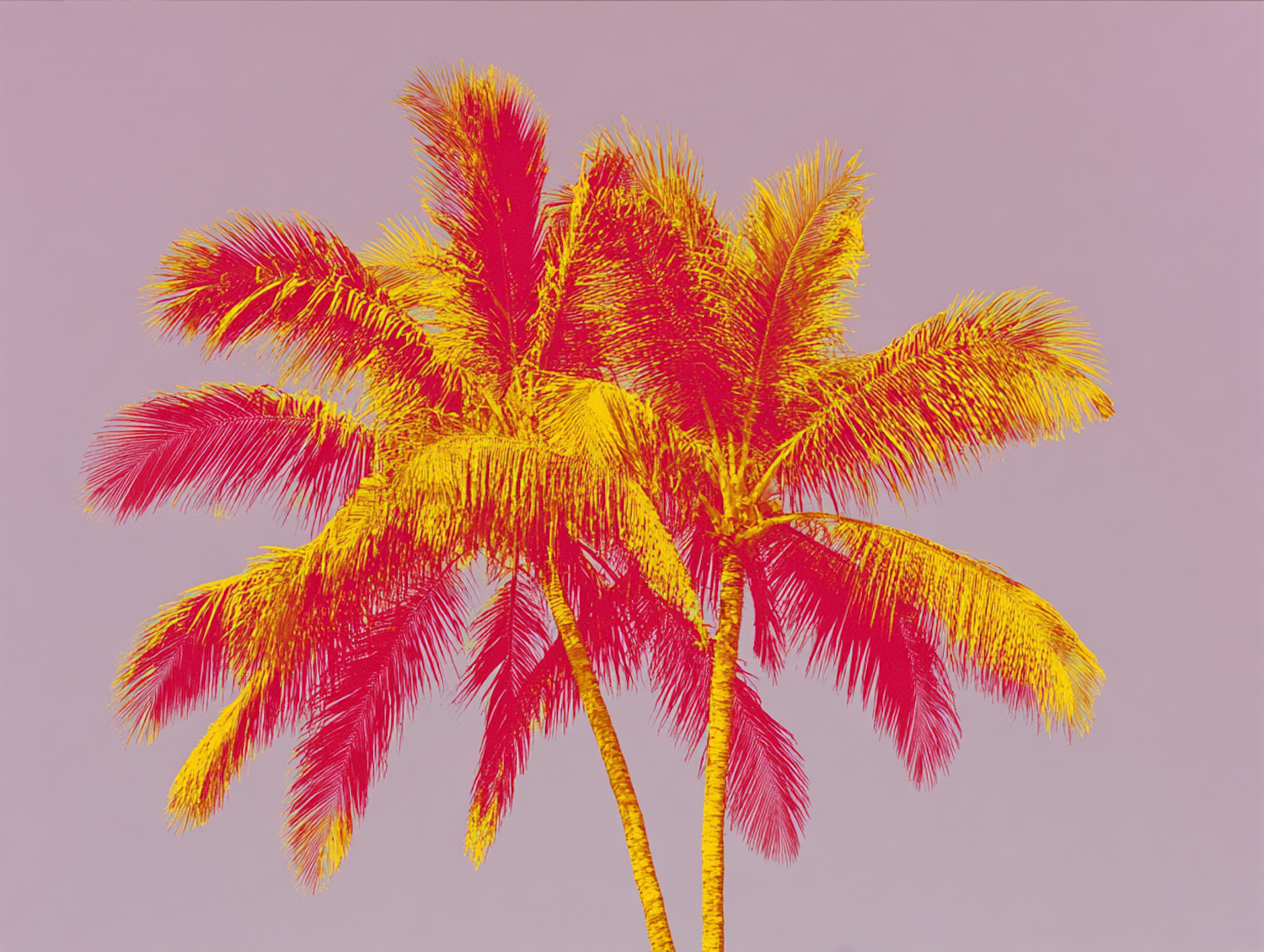 Digital artwork of vibrant palm trees in yellow and red hues with a soft pink background, evoking a bold tropical aesthetic.