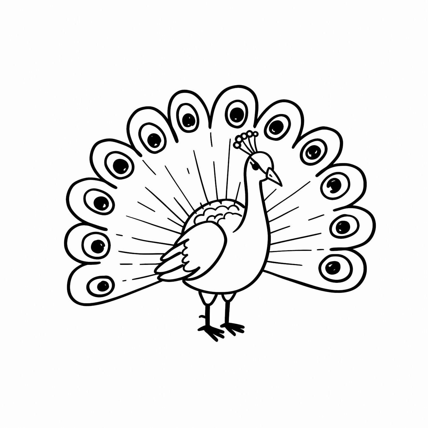 Stylized black-and-white illustration of a peacock with its tail feathers fanned out, featuring eye-like patterns on the feathers.