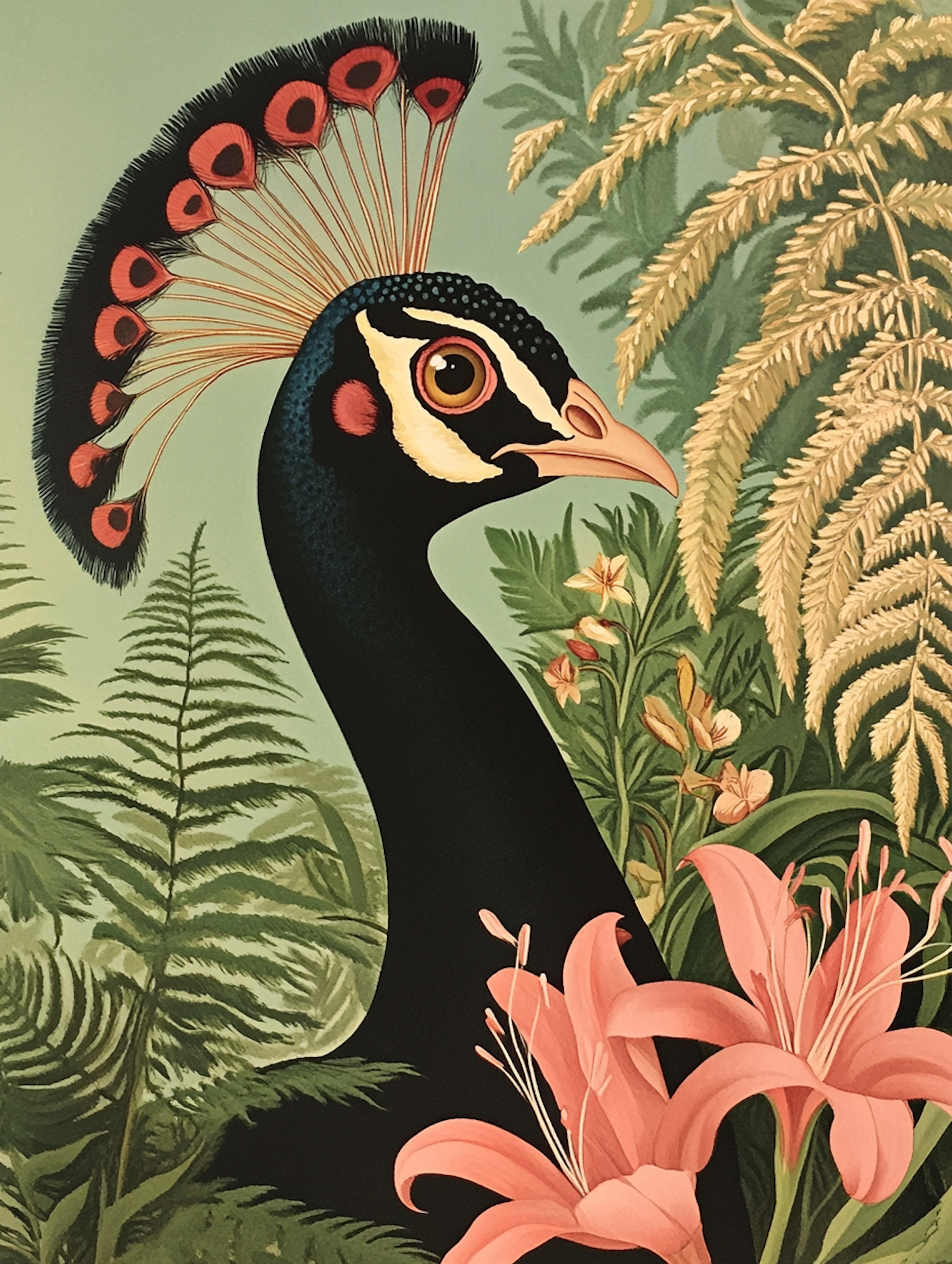 Illustration of a bird with a striking crest among lush ferns and pink lilies, set against a soft green background.