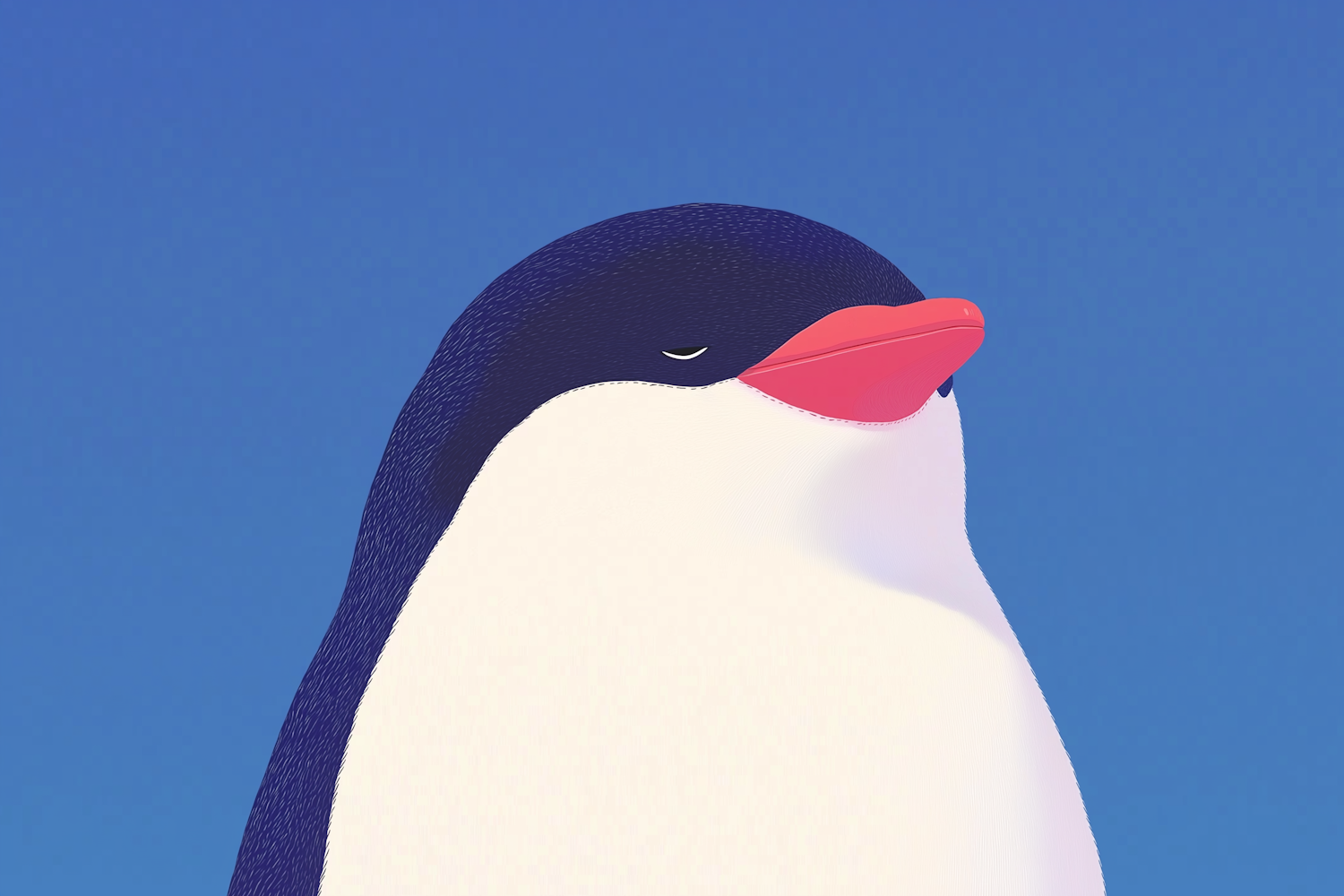 Minimalist penguin illustration with a serene expression, navy-blue and white body, pink beak, and clear blue background.