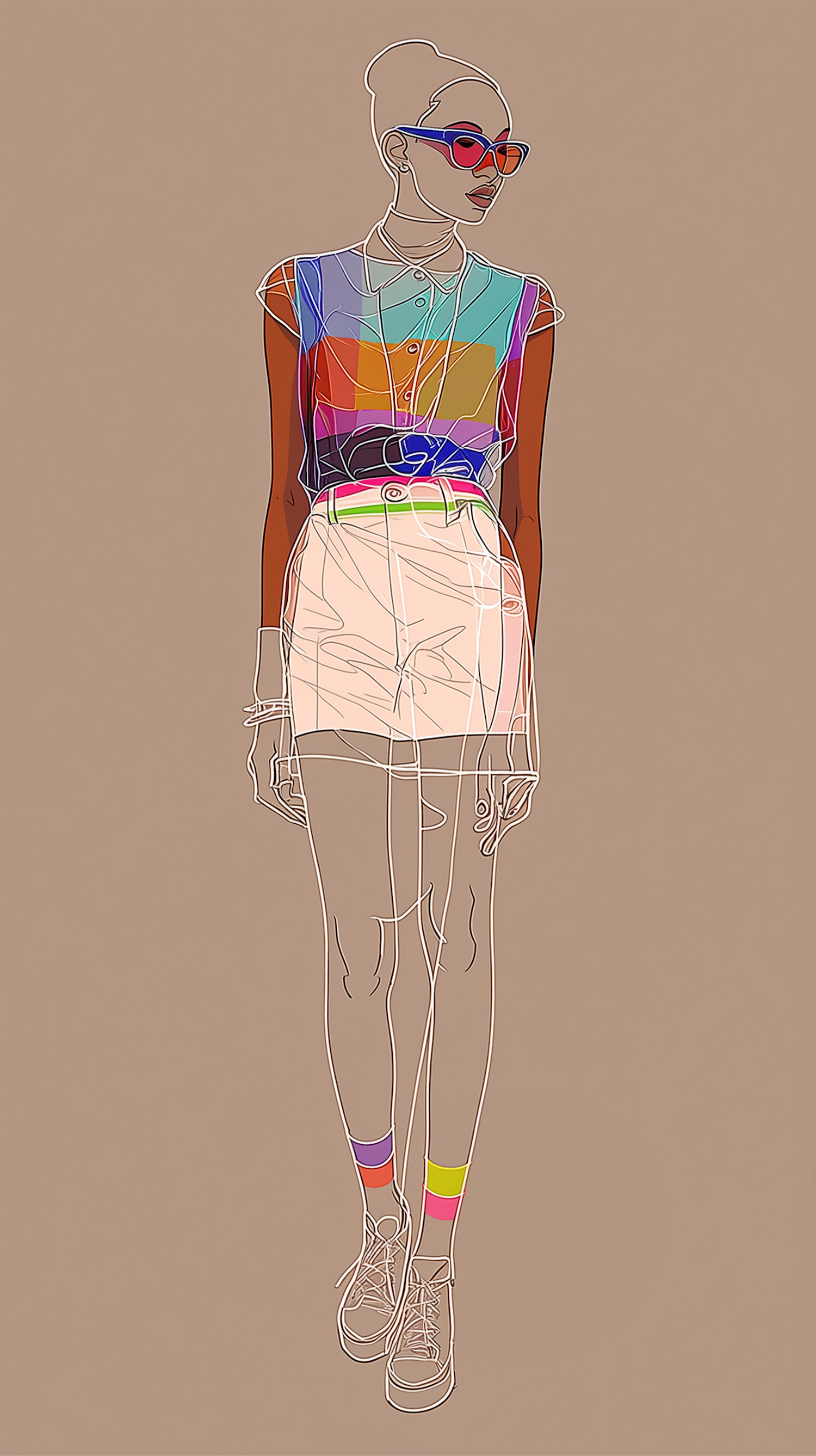 Stylized illustration of a person in a colorful outfit with bold lines and vibrant hues, set against a beige background.