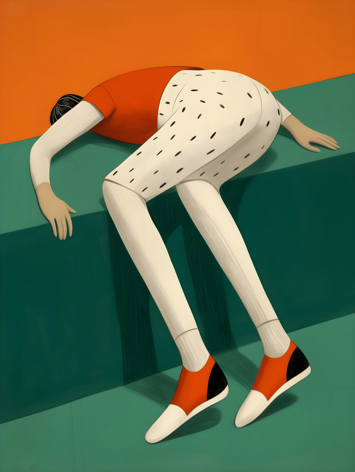Stylized illustration of a person in a red shirt and spotted pants leaning over a green surface, set against a vibrant orange background.