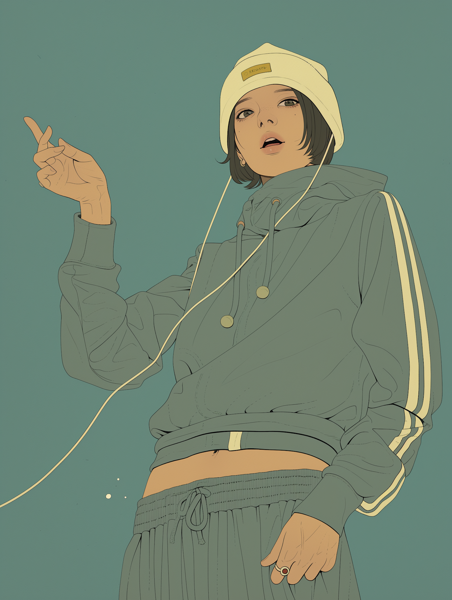 Stylized illustration of a young woman in a teal tracksuit and white beanie, with earphones and a relaxed expression.