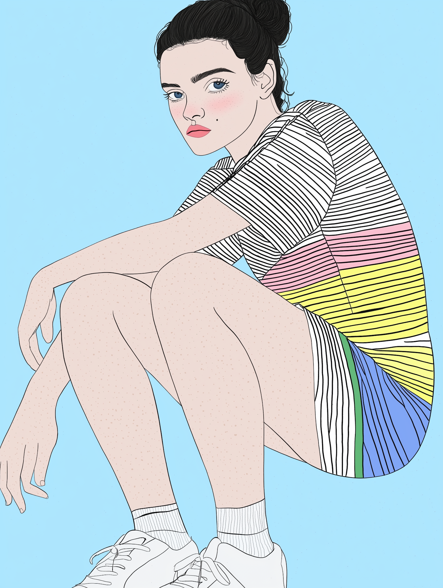 Stylized illustration of a woman in a colorful striped dress against a light blue background, featuring bold lines and flat colors.
