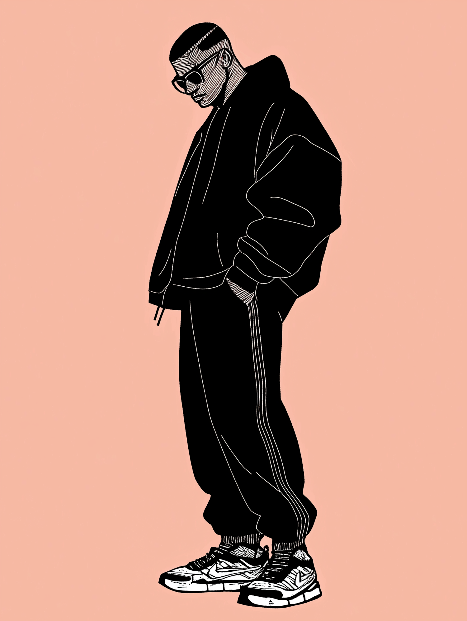 Stylish illustration of a person in a black hoodie and track pants, wearing sunglasses, against a peach background.