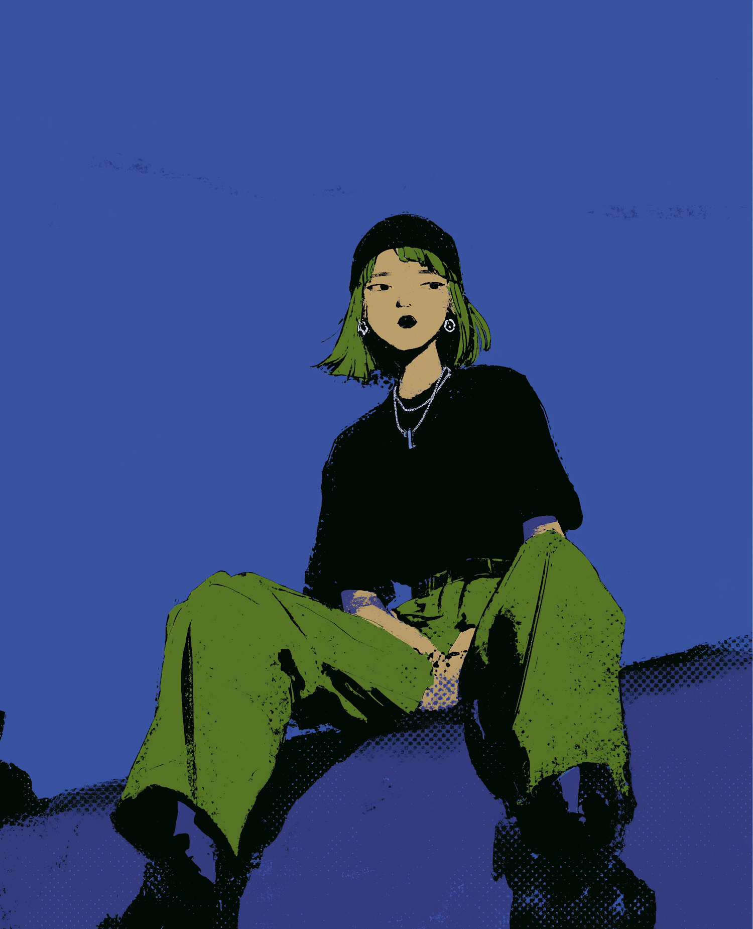 Stylized illustration of a person with green hair, black beanie, and green pants sitting against a bold blue background.