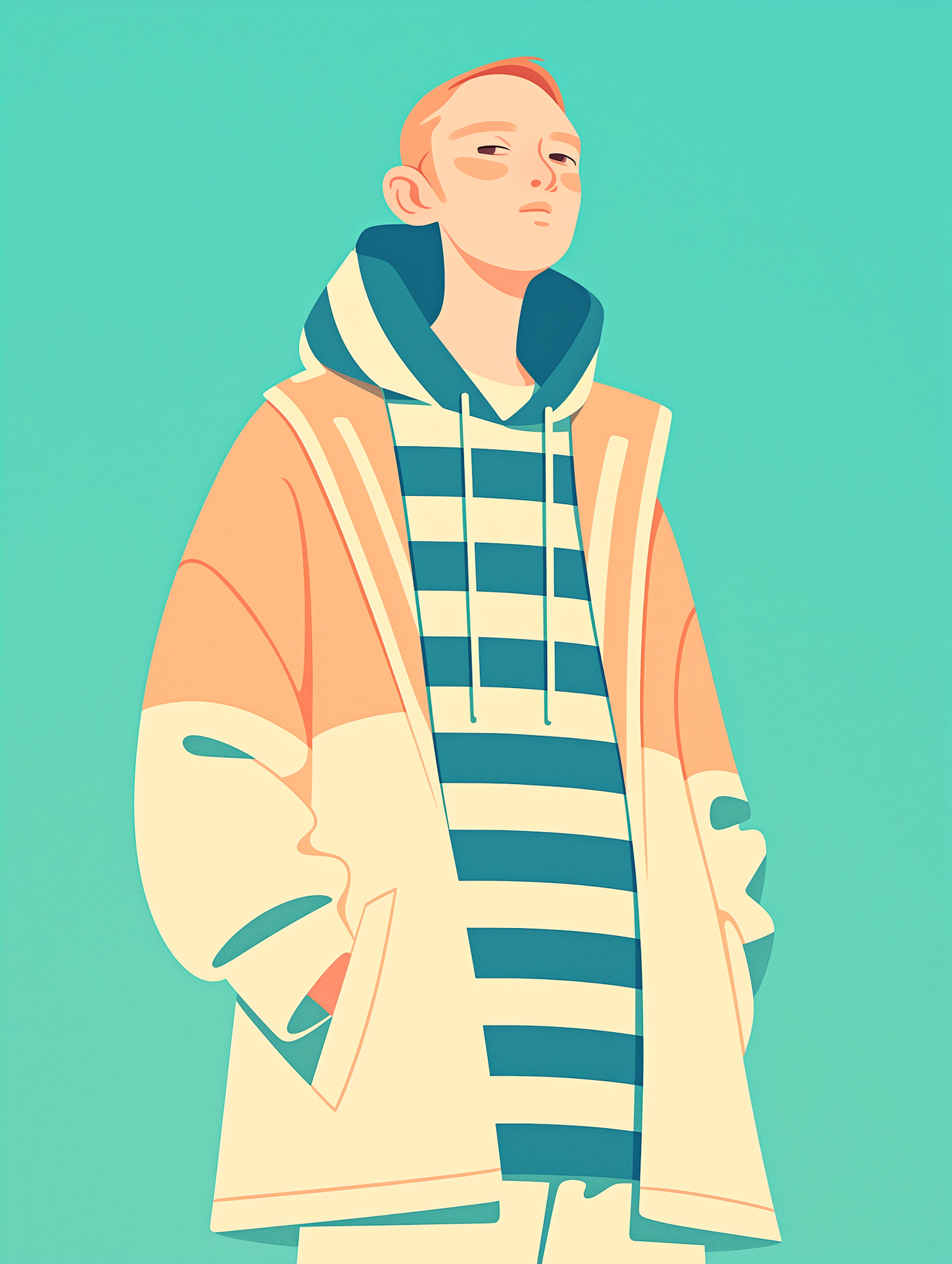 Stylized illustration of a confident young person in a striped hoodie and oversized jacket against a teal background.
