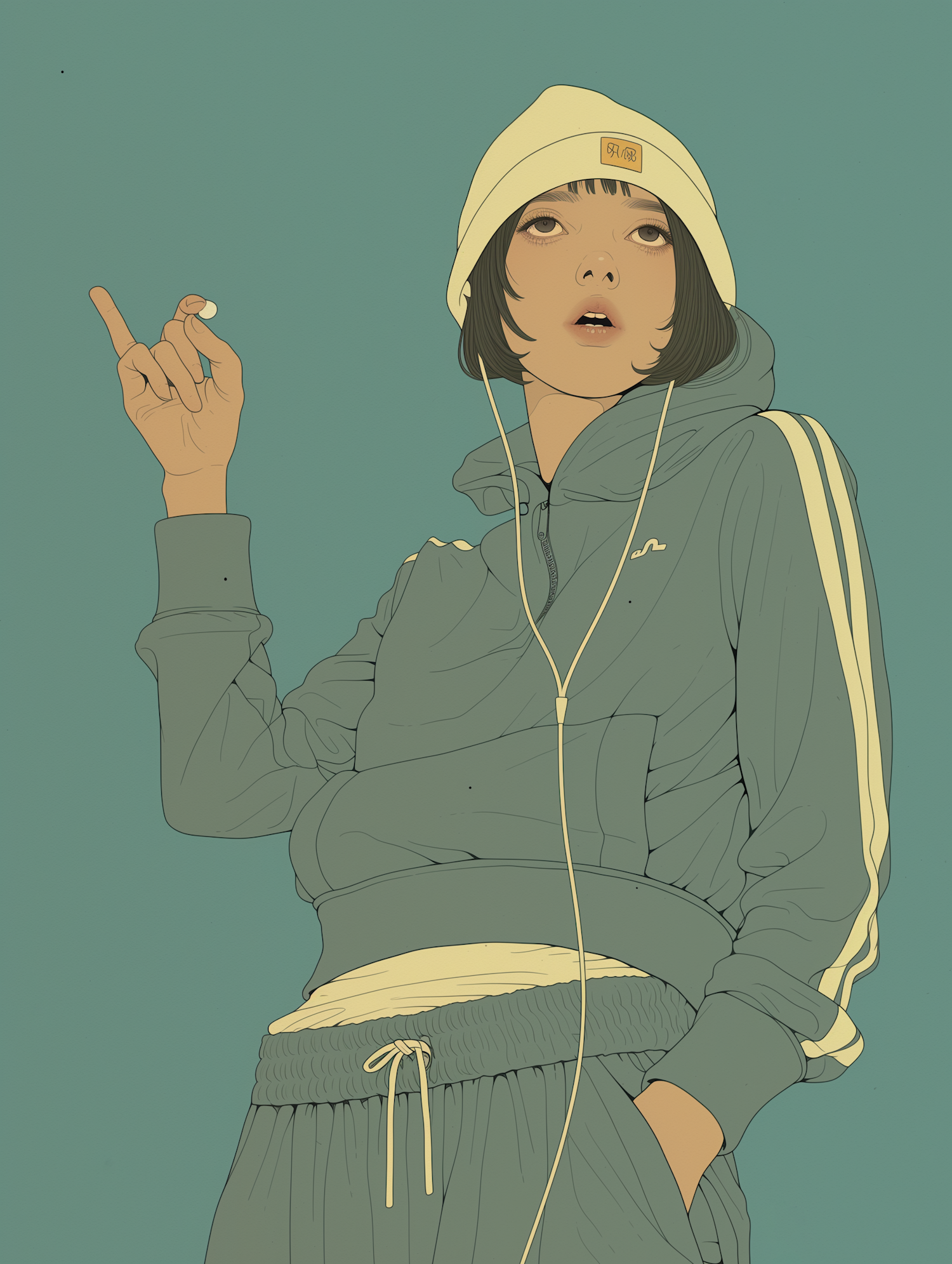 Stylish illustration of a young woman in a teal tracksuit and beanie, listening to music with earphones against a teal background.