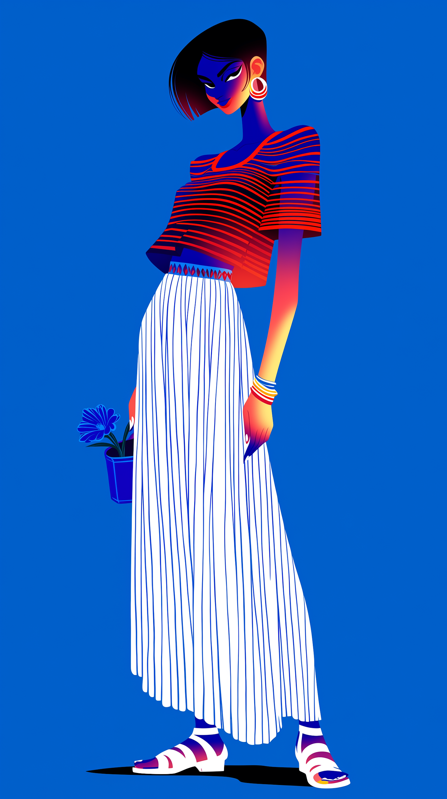 Stylized illustration of a person in vibrant attire holding a potted plant, set against a bold blue background.