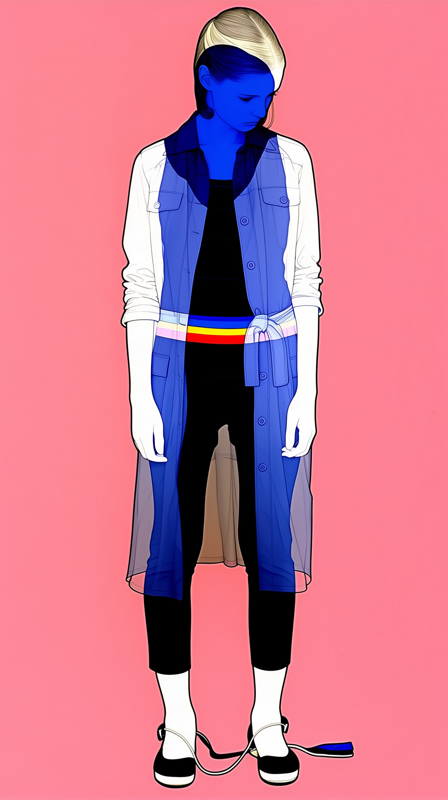 Stylized illustration of a person in layered clothing with vibrant colors and a pink background, showcasing a modern and artistic design.