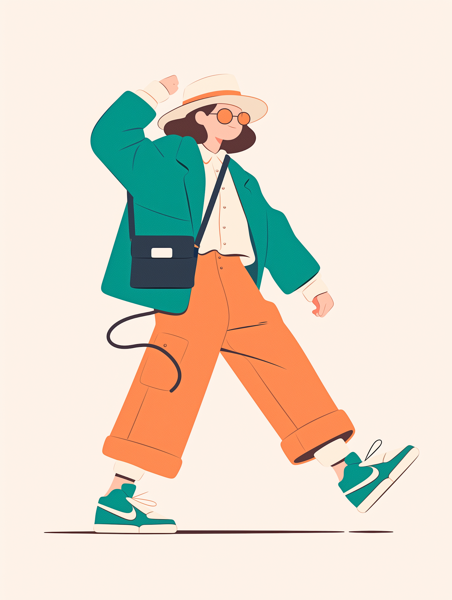 Stylish illustration of a person in a teal jacket, orange pants, and a hat, walking confidently with a crossbody bag.