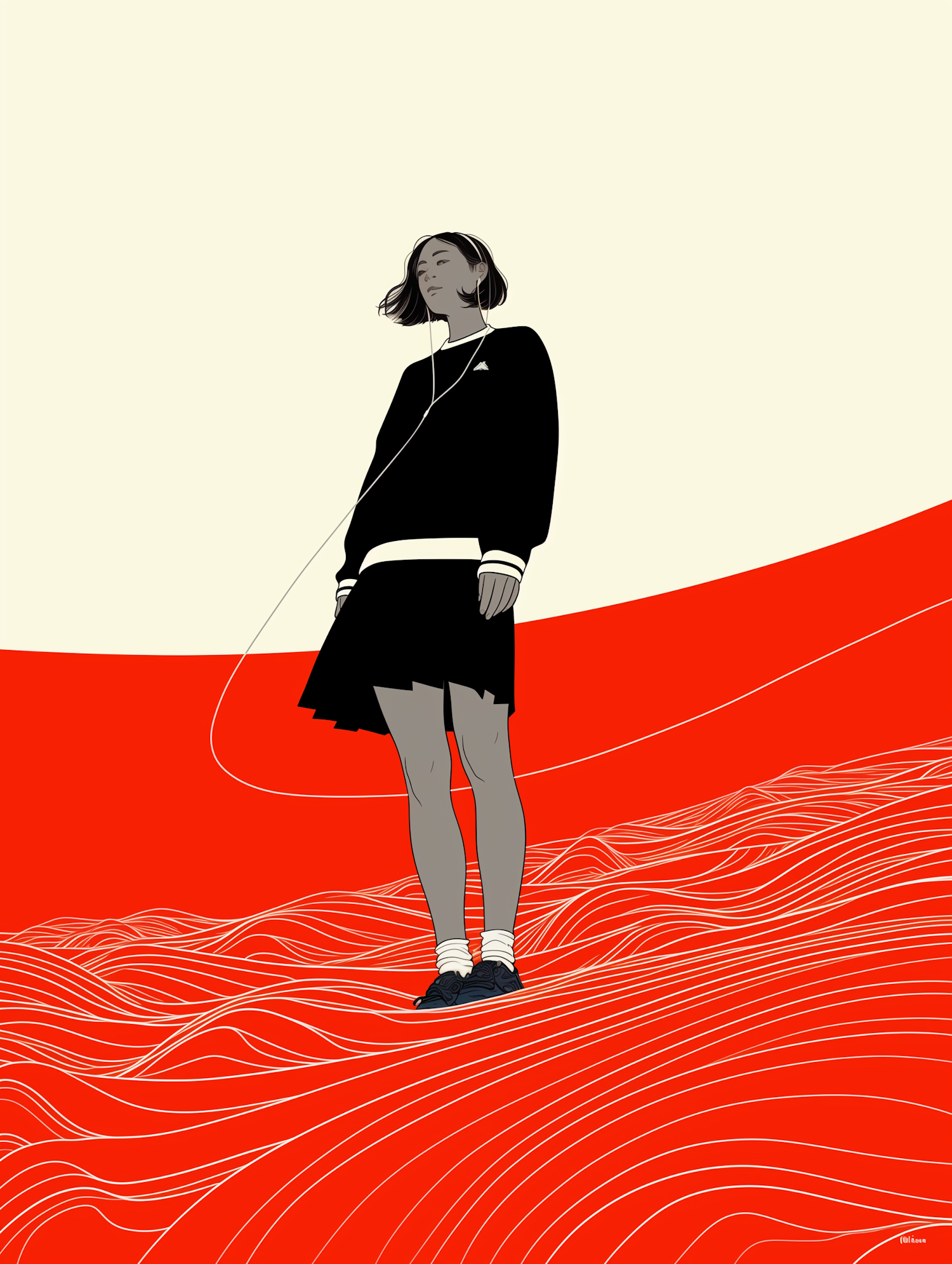 Stylized illustration of a person with earphones against a bold red and cream abstract background with flowing lines.