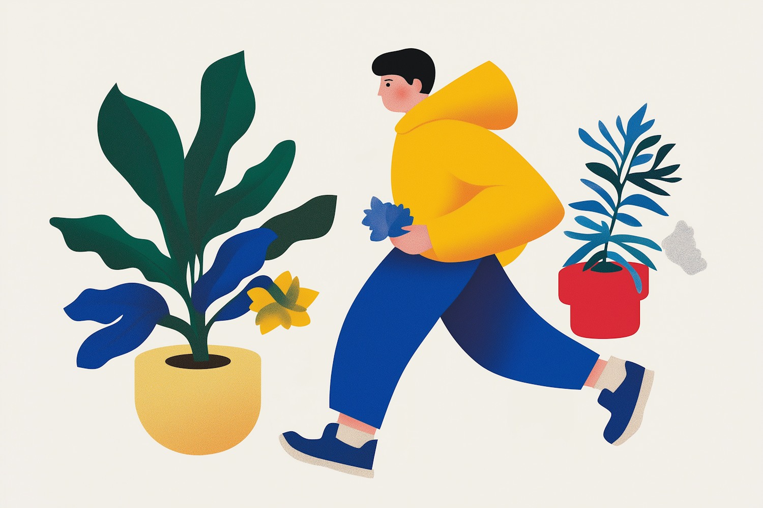 Vibrant illustration of a person in a yellow hoodie walking with plants and flowers, featuring bold colors and playful design.