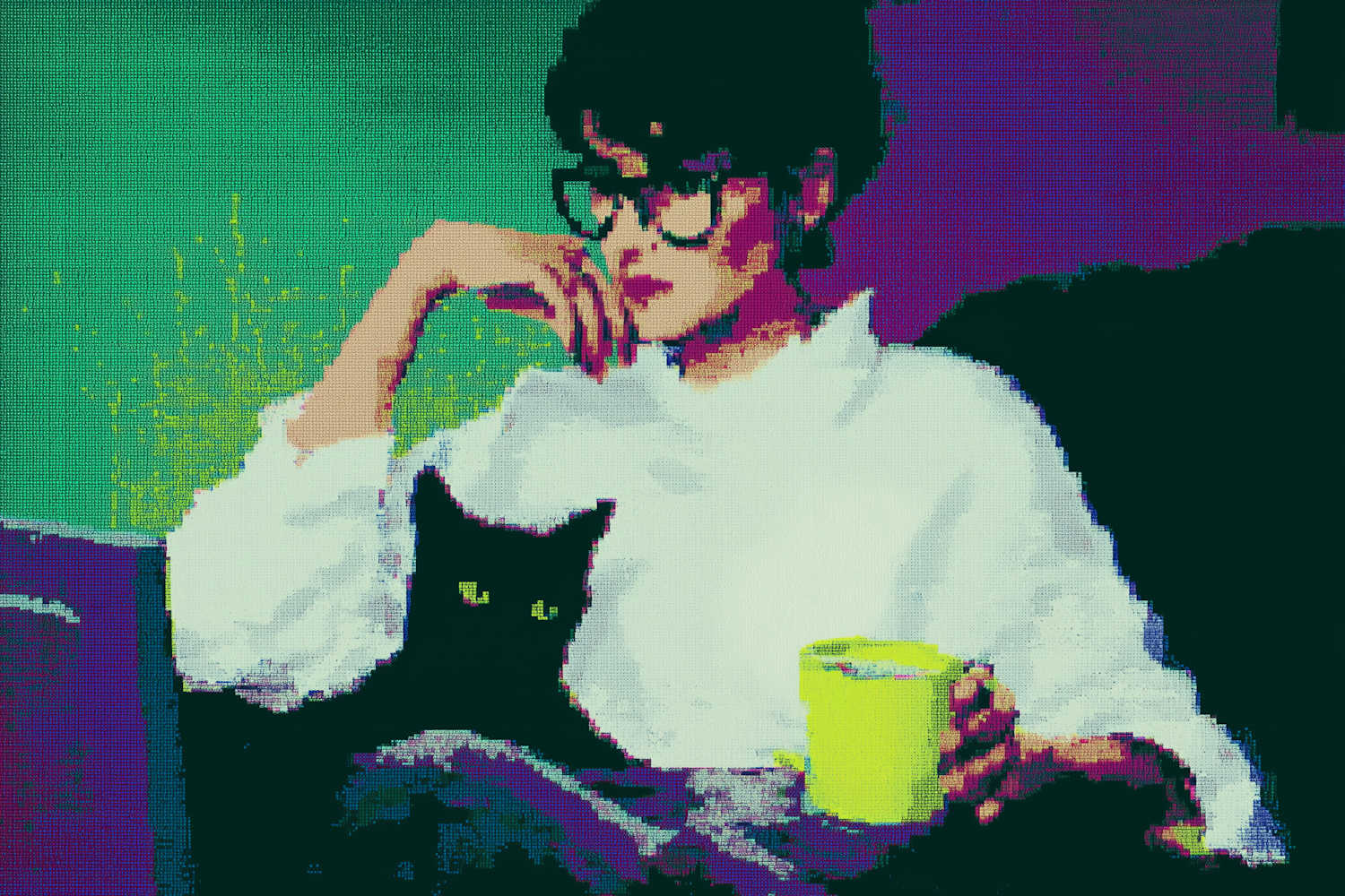 Artistic depiction of a person with a black cat in a cozy setting, with vivid colors and a textured effect on a glitch pixel background.