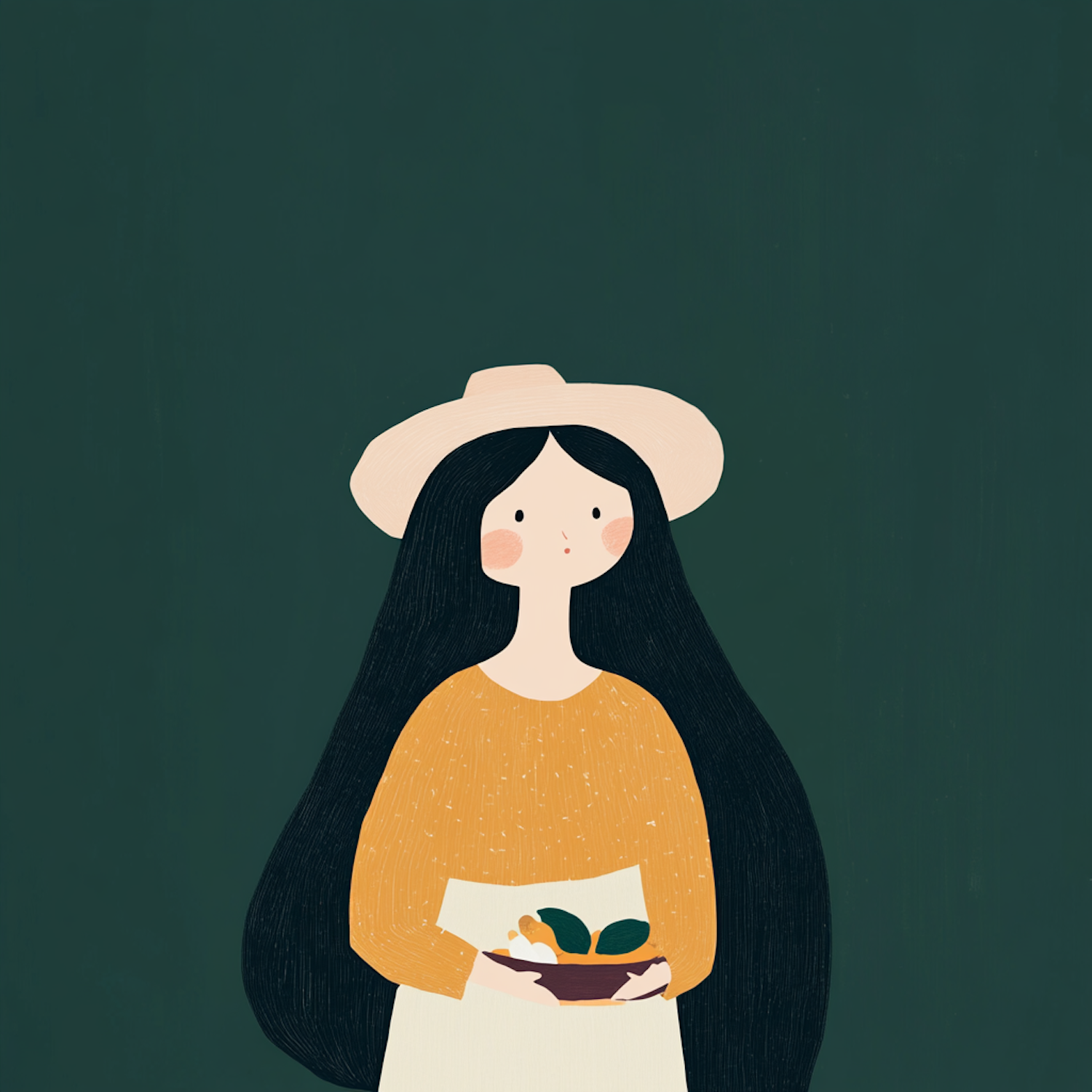 Whimsical illustration of a woman with long hair, wearing a hat and holding a bowl of fruit against a dark green background.