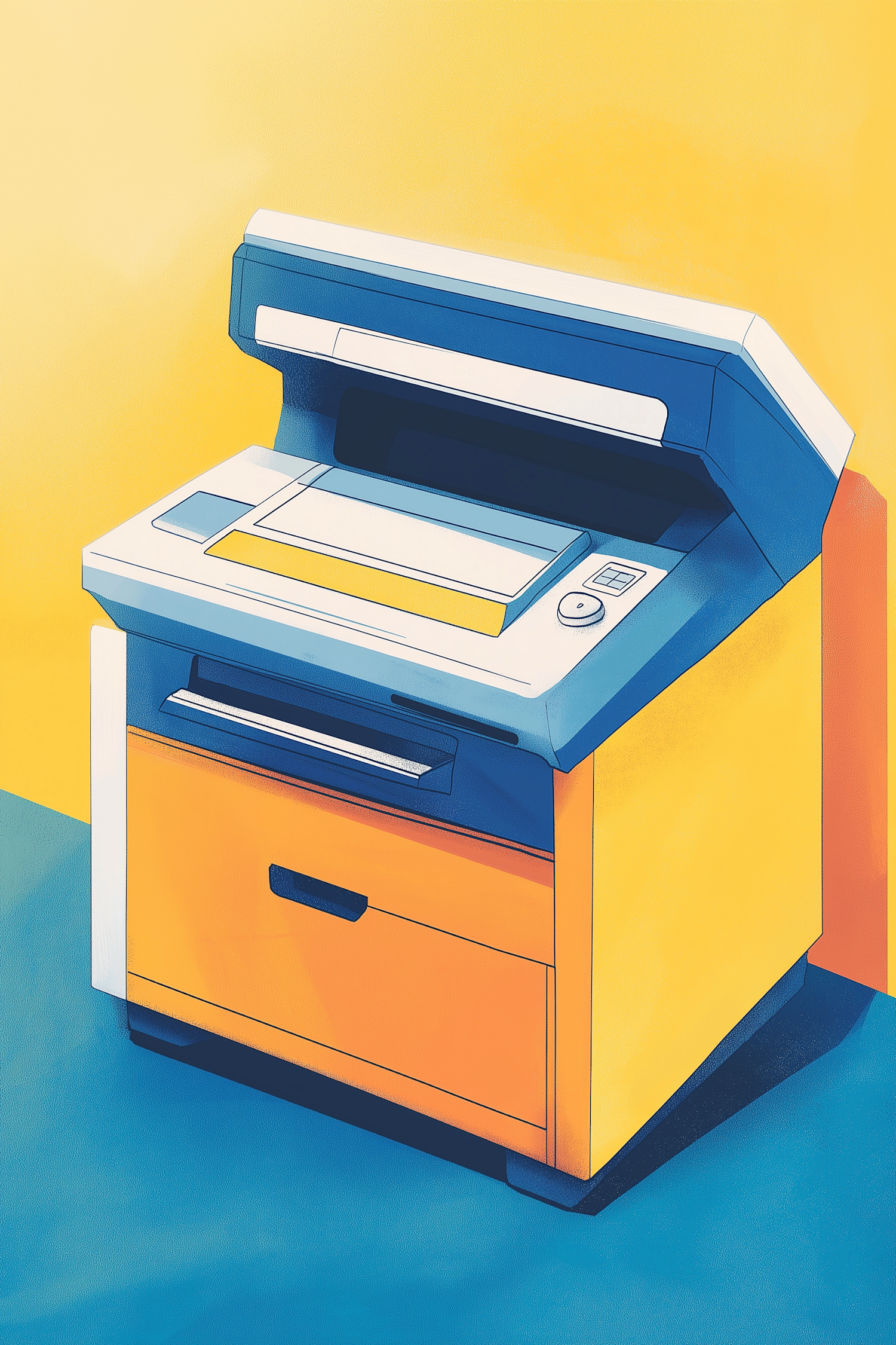Vibrant illustration of a photocopier with bold colors and modern design, featuring blue, yellow, and orange hues.