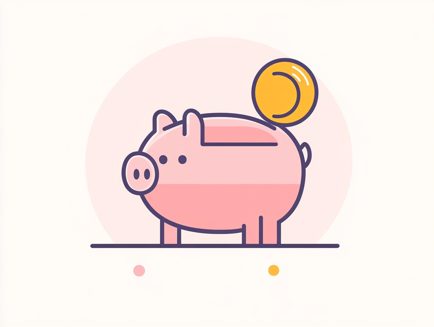 Minimalist illustration of a pink piggy bank with a gold coin, symbolizing savings and financial growth.