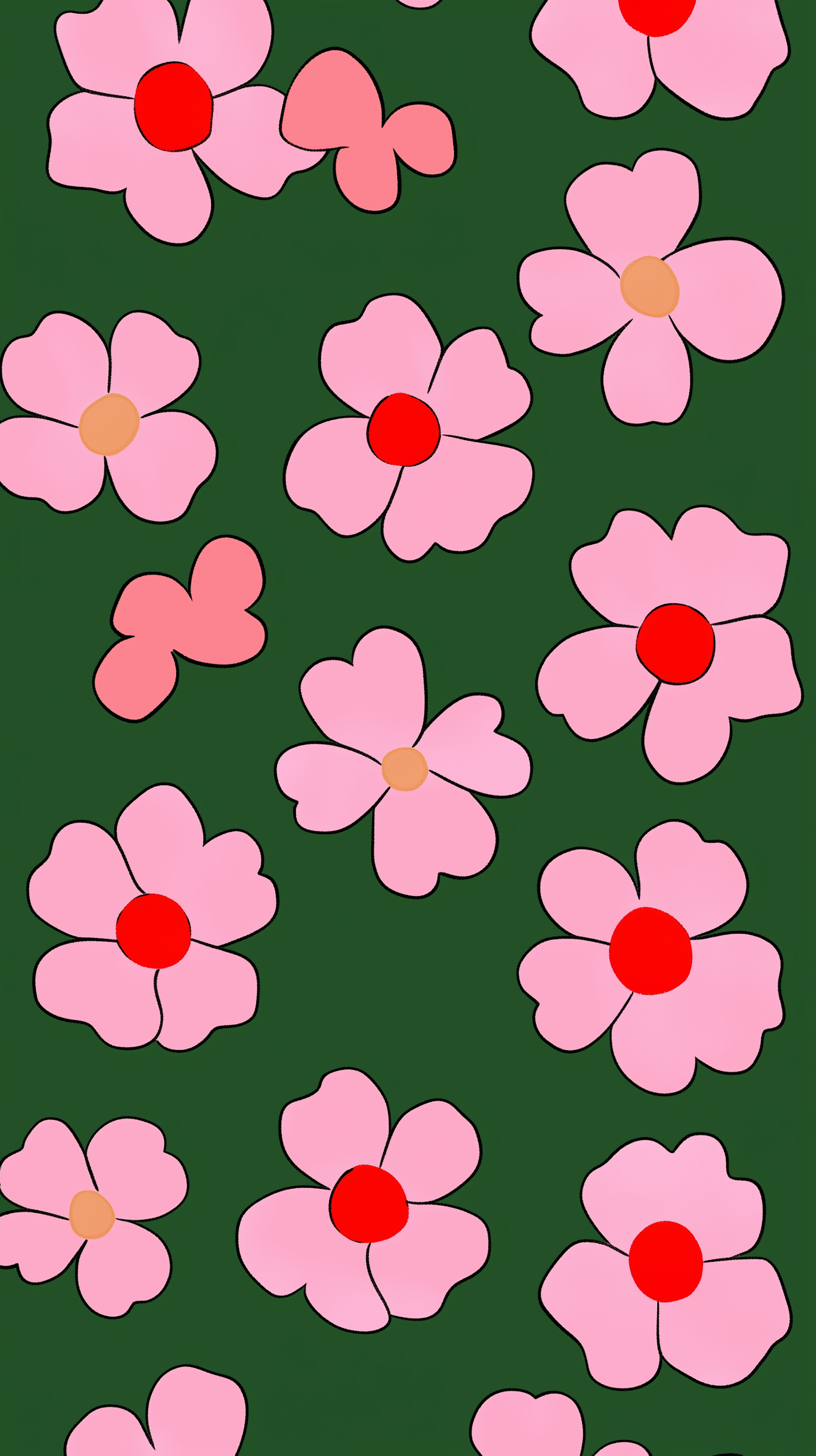 Stylized pink flowers with red centers on a dark green background create a vibrant and playful pattern.