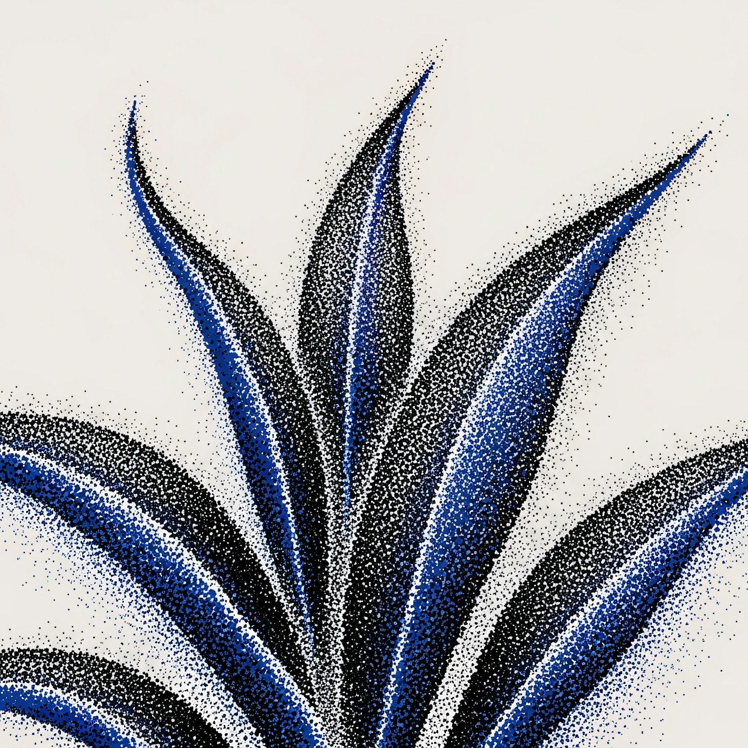 Stylized illustration of a plant with blue and black stippled leaves on a light background, creating a striking and textured design.