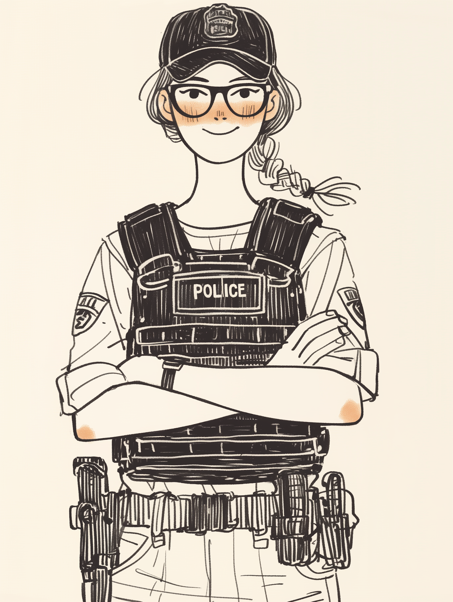 Cartoon illustration of a female police officer with a braid, glasses, and a police vest, exuding confidence and professionalism.