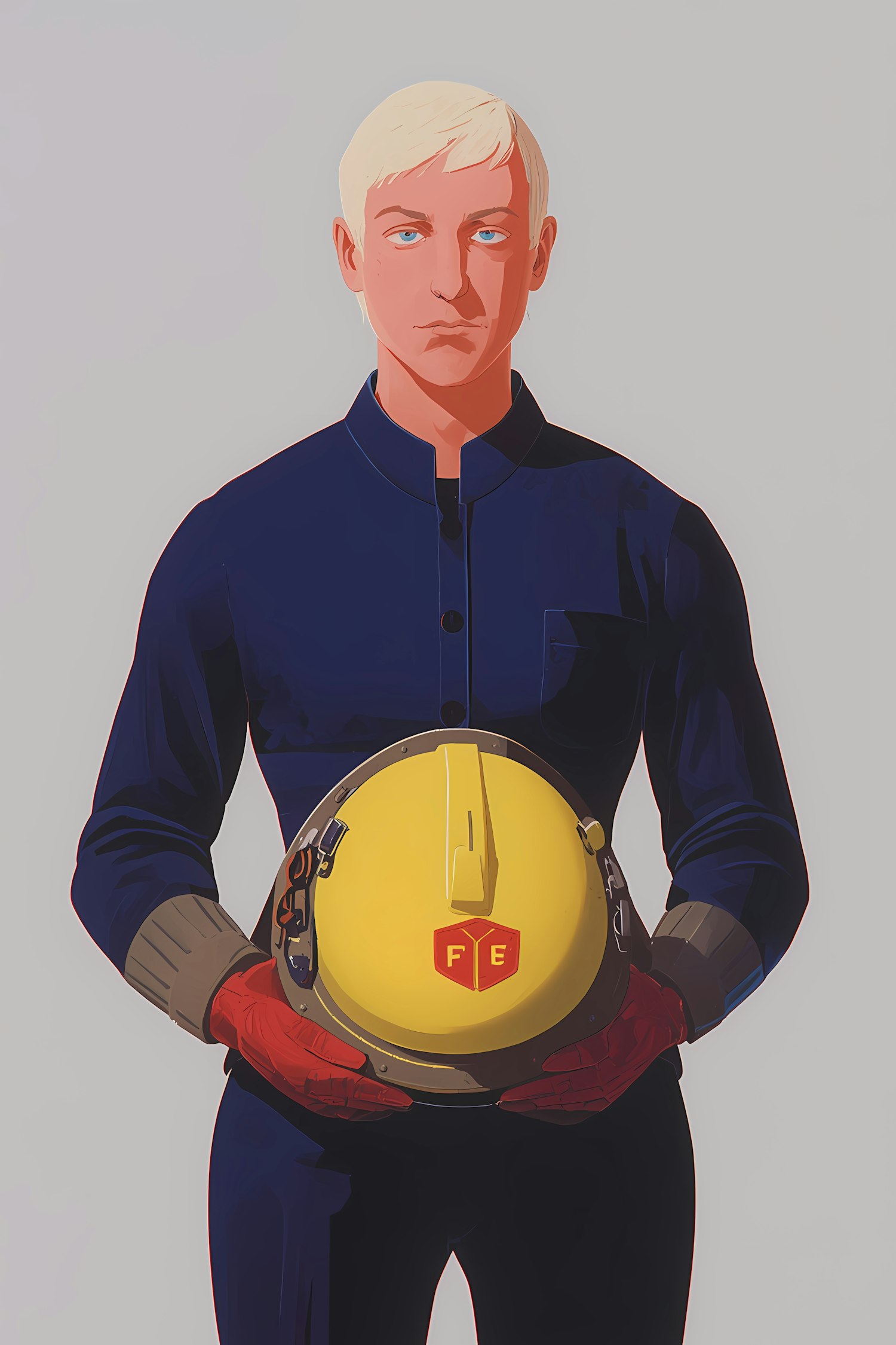 Stylized illustration of a person in a blue uniform holding a yellow helmet with a red 'FE' emblem, set against a plain gray background.