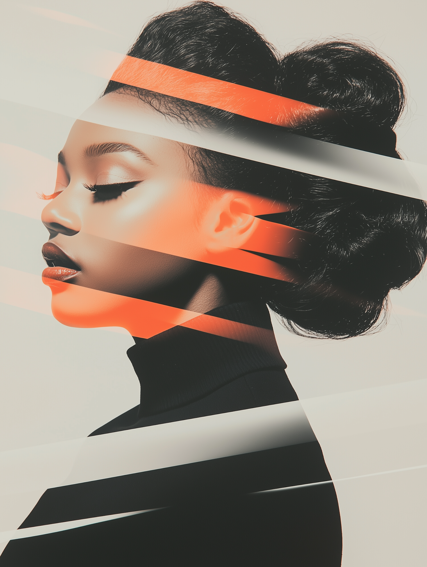 Stylized portrait of a woman with bold makeup, sleek bun, and abstract orange and white streaks over a minimalist background.