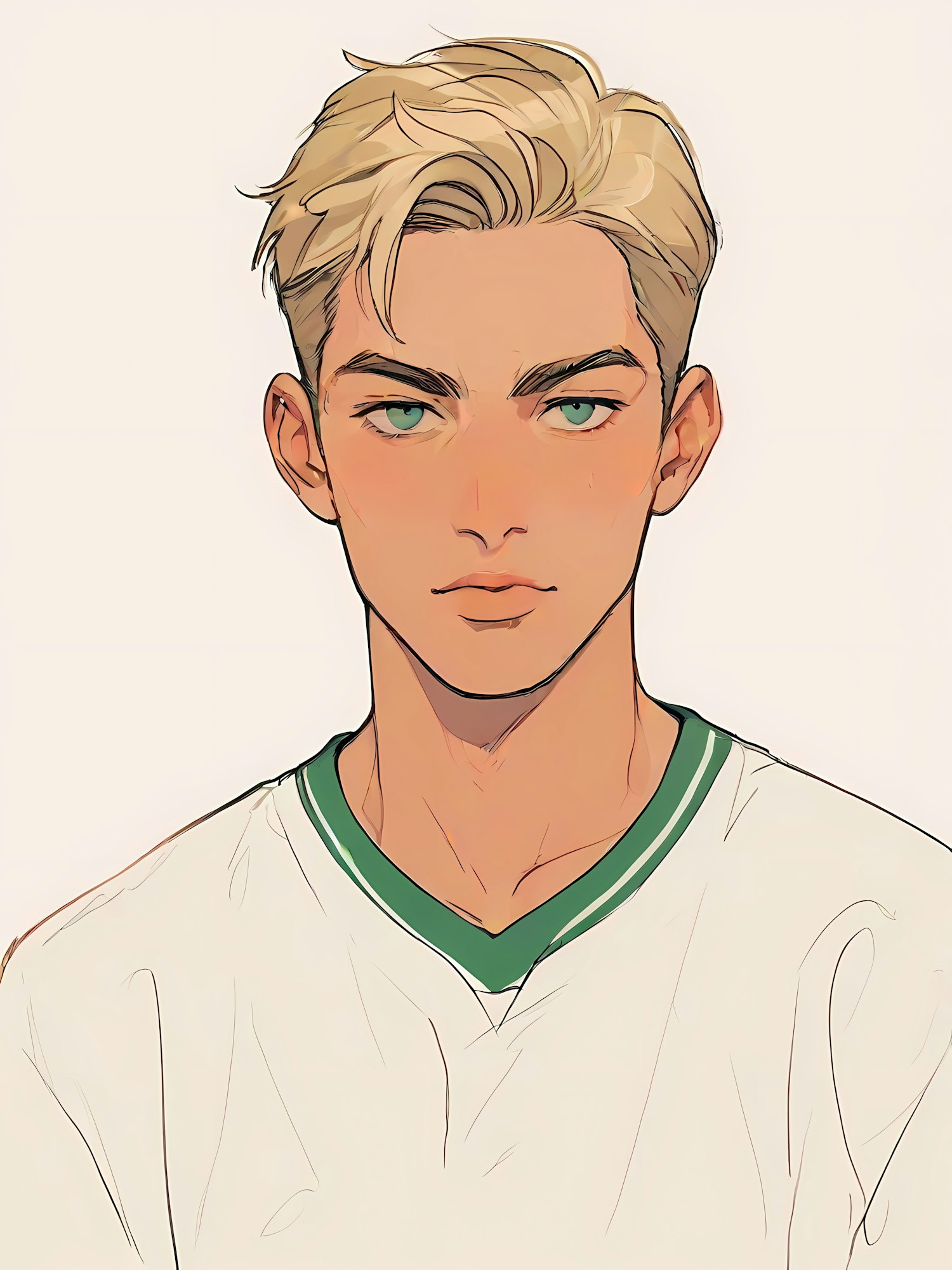 Stylized illustration of a young man with blonde hair, green eyes, and a white shirt with green trim, set against a plain beige background.