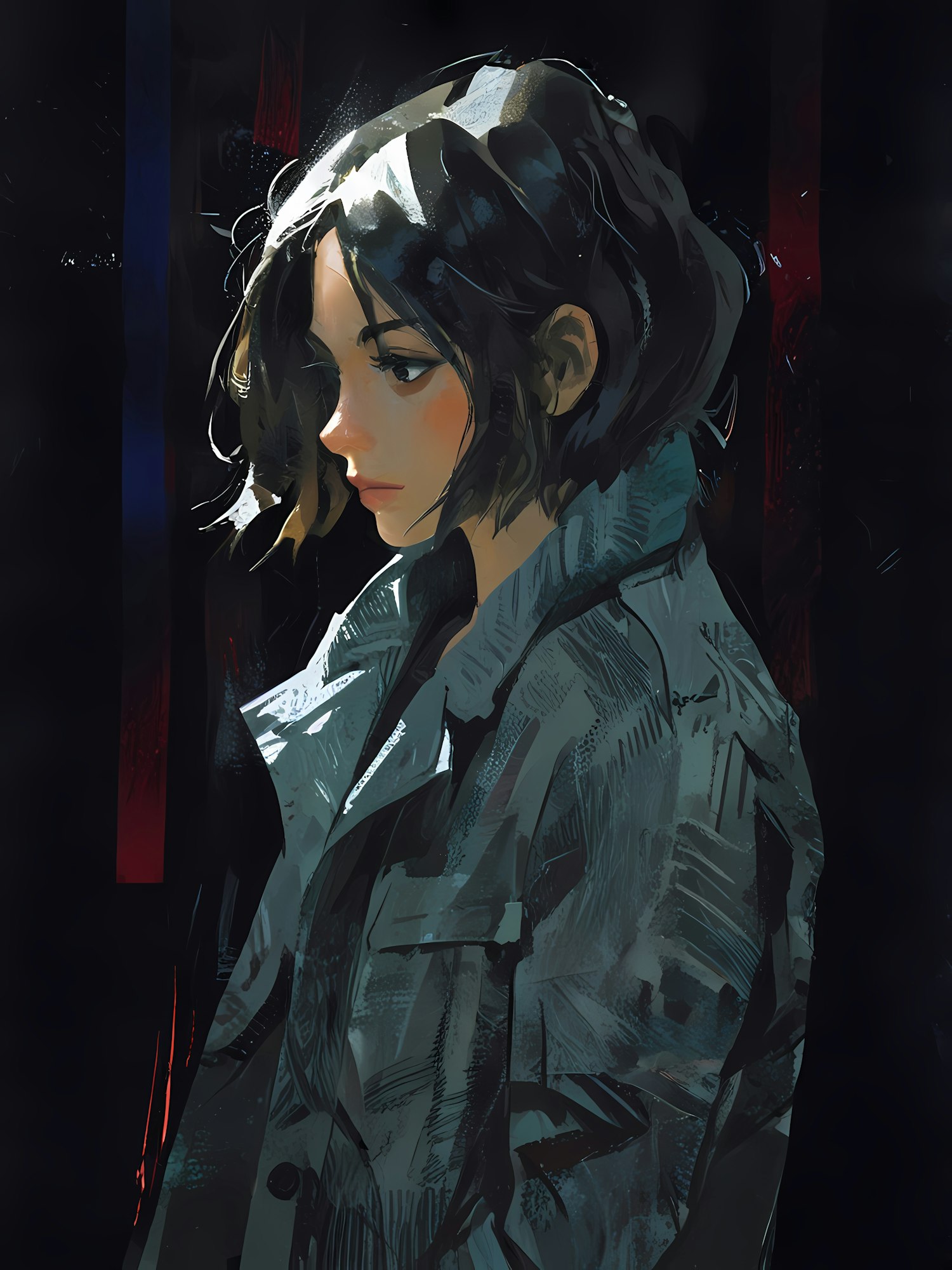 Stylized illustration of a person with short, wavy black hair and reflective expression, set against a dark background with dramatic lighting.