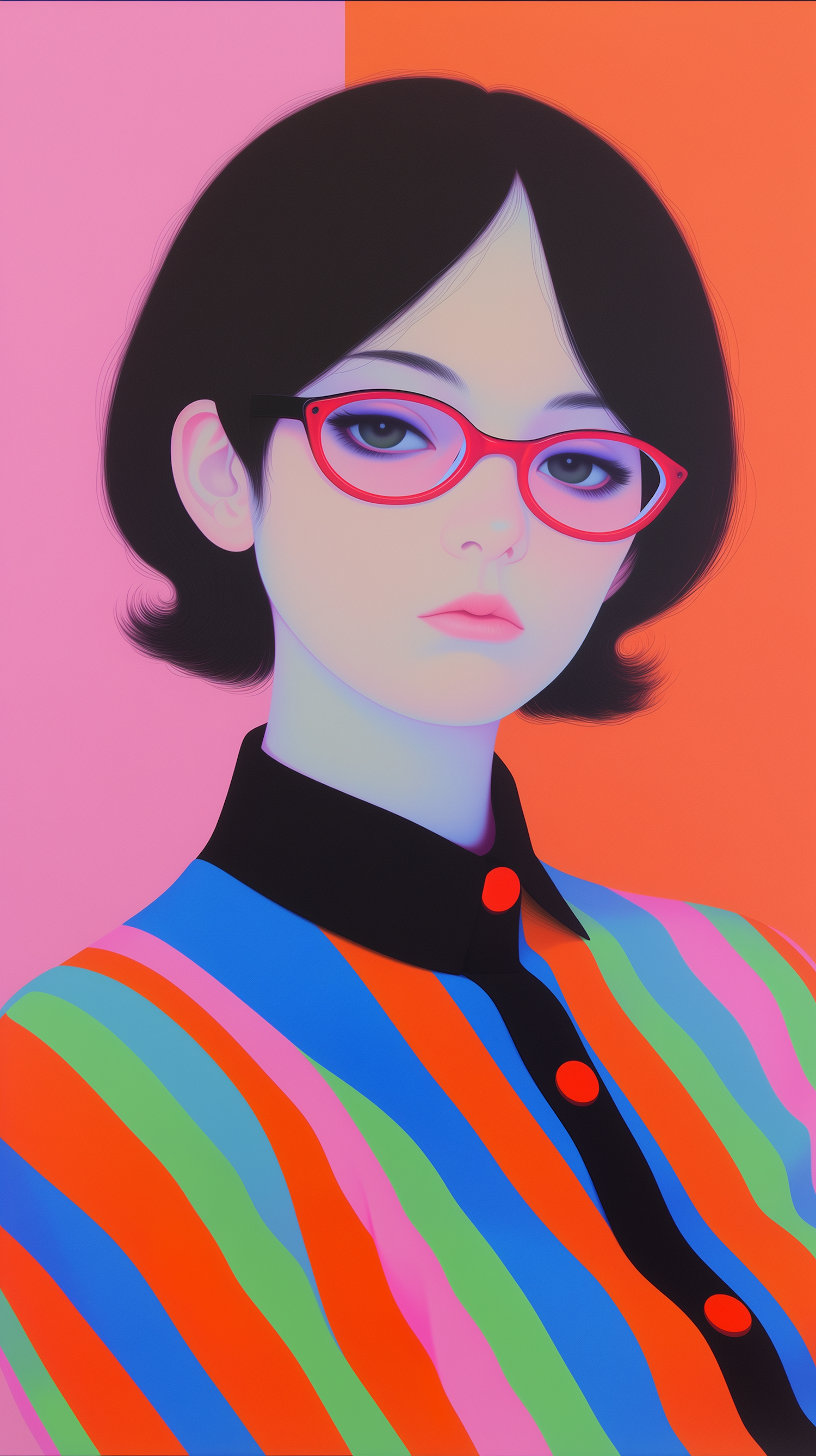 Stylized portrait of a person with red glasses and a colorful striped shirt against a bold pink and orange background.