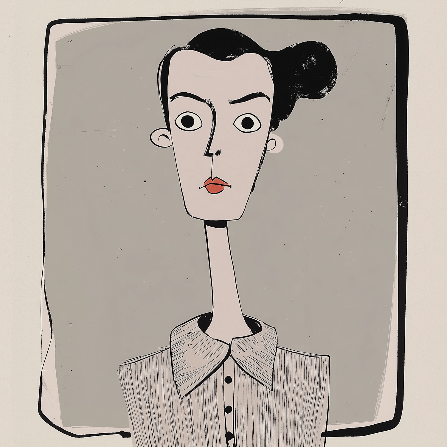 Stylized illustration of a person with a long neck, large eyes, and a collared shirt, set against a muted gray background.