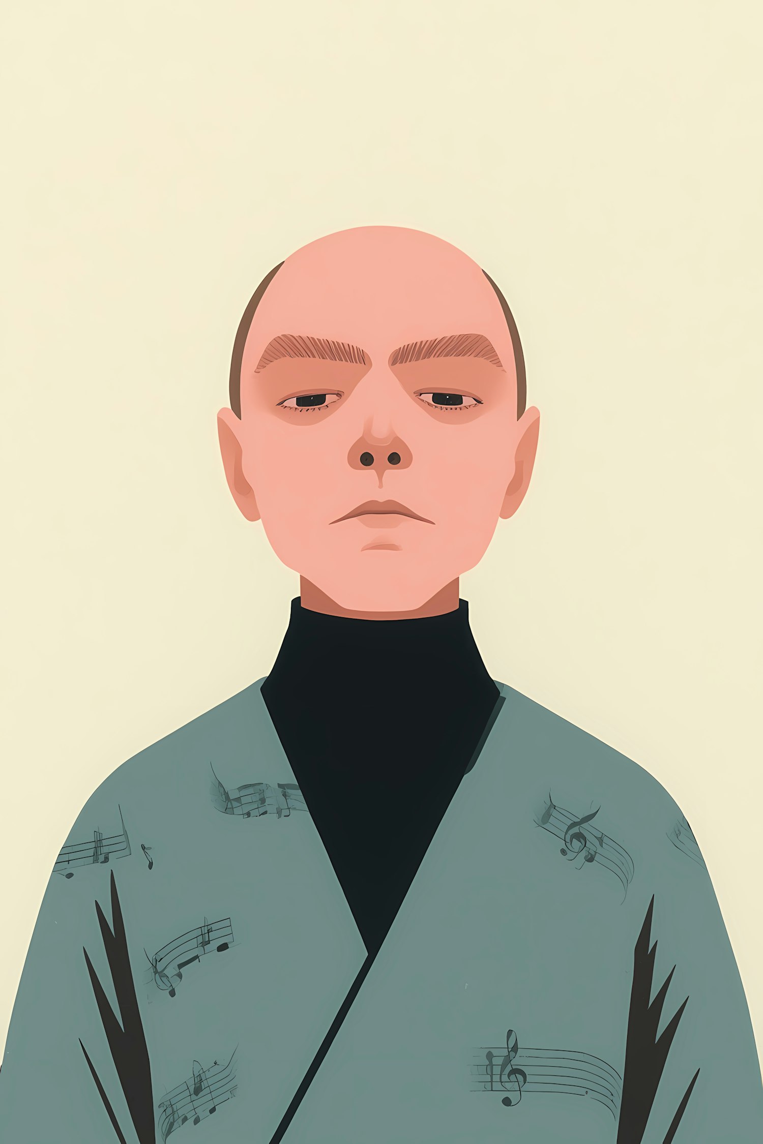 Stylized illustration of a person in a teal garment with musical notes, set against a light beige background.
