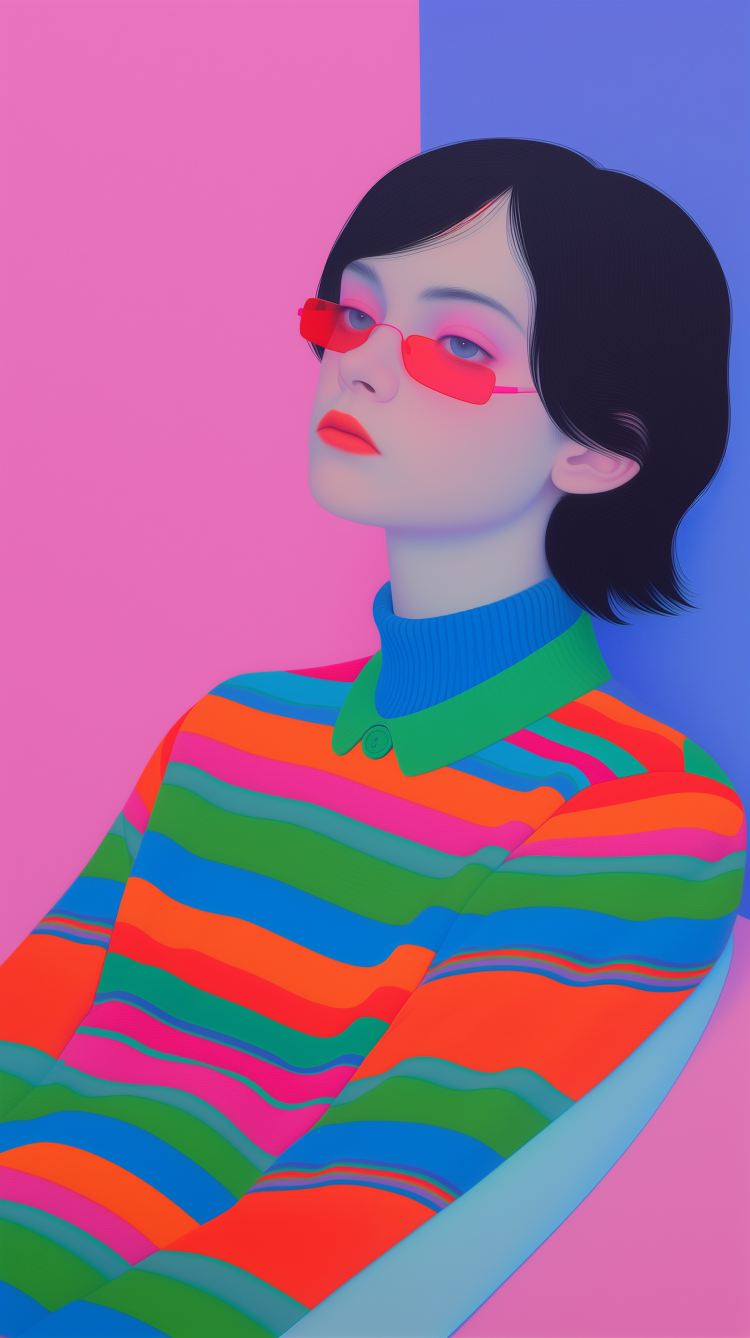 Stylized portrait of a person in red glasses and a colorful striped sweater against a pink and blue background.