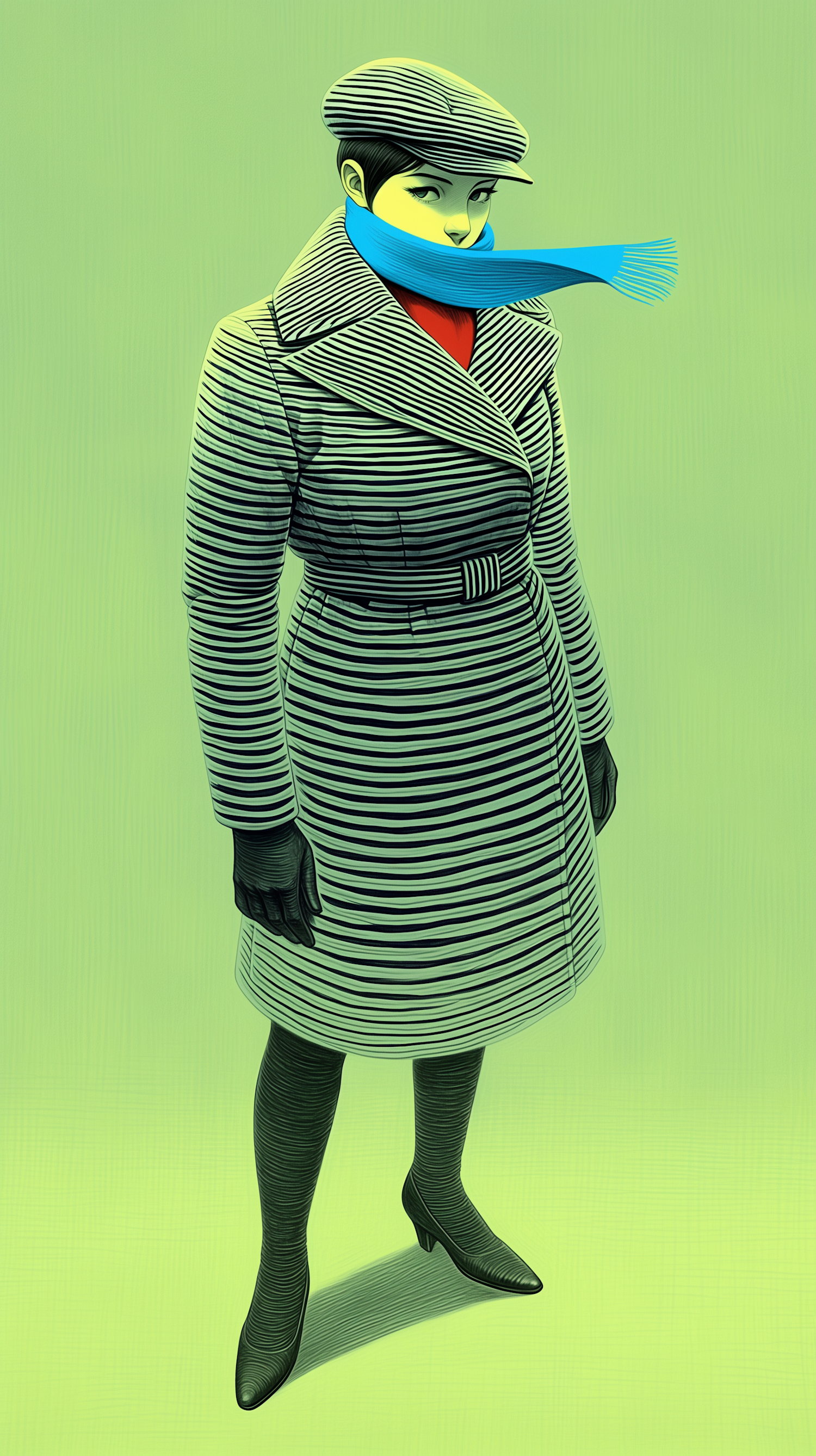 Stylized illustration of a person in a striped coat and blue scarf against a green background, showcasing bold lines and vibrant colors.