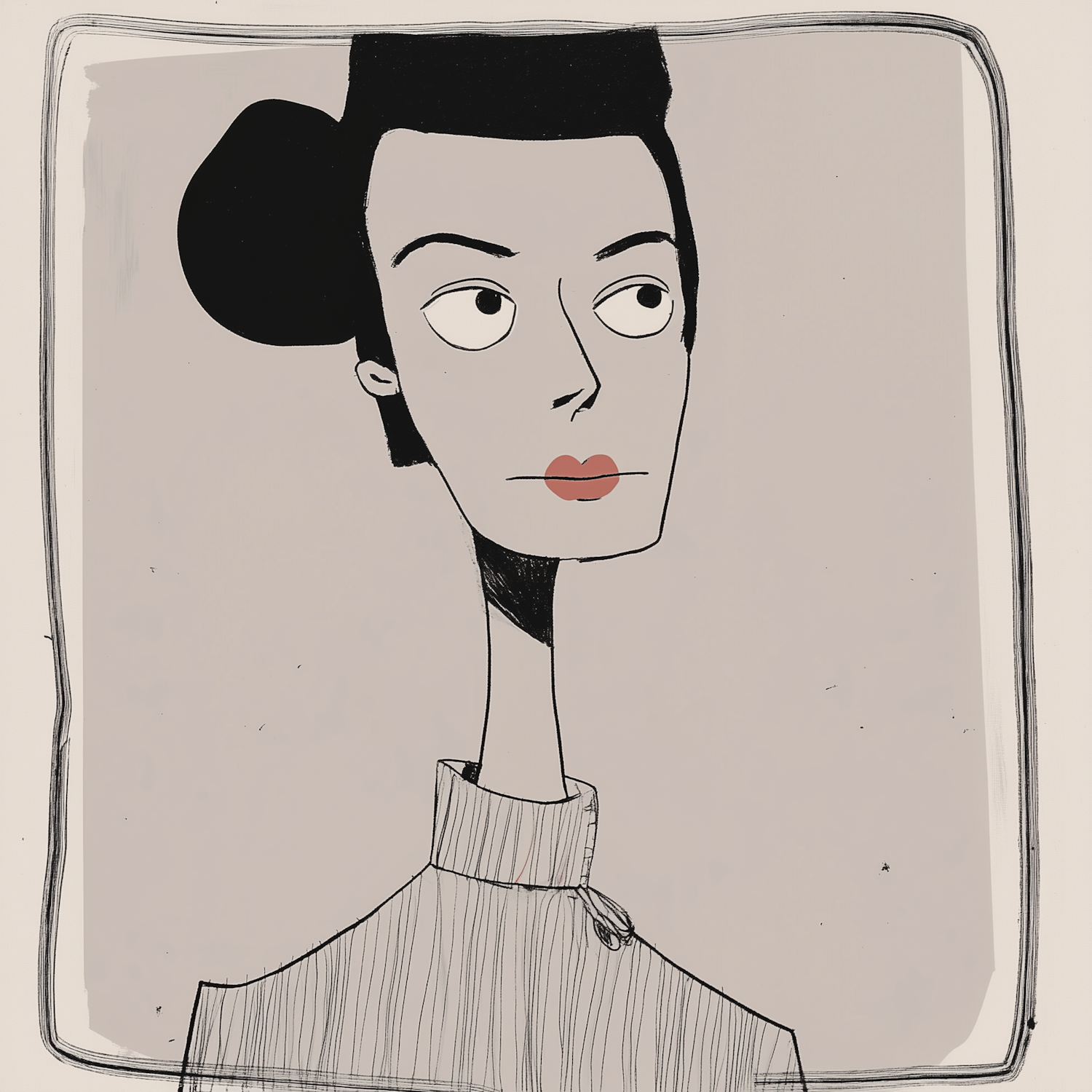 Stylized illustration of a person with exaggerated features, wearing a high-collared outfit, set against a minimalist gray background.
