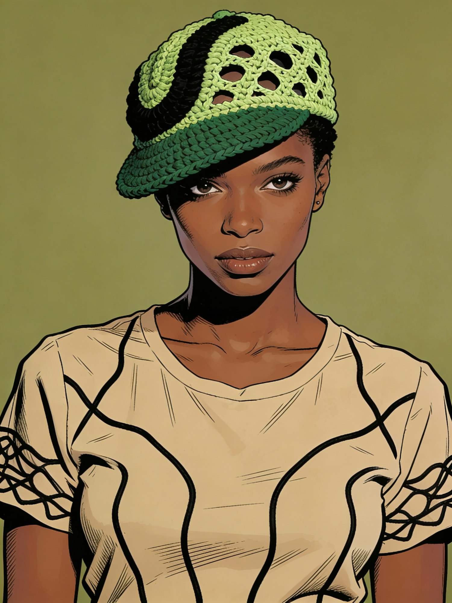 A Black woman with rich brown skin wears a handcrafted crocheted cap in light green, deep forest green, and black. The cap features openwork patterns and curved color sections, giving it a sculptural, artisanal quality. She faces forward in a relaxed pose, wearing a taupe shirt with black piping that traces abstract, organic shapes across the chest and sleeves. The lighting is soft and even, highlighting the textures of the yarn and fabric. For visual cohesion, the background is a plain, complementary tone—either muted sage green or warm clay beige—to harmonize with both her skin and the outfit’s palette. The mood is quietly confident and artful, emphasizing craftsmanship, texture, and contemporary style. Hyperrealistic rendering should focus on yarn detail, fabric folds, and skin texture with subtle lighting gradients.